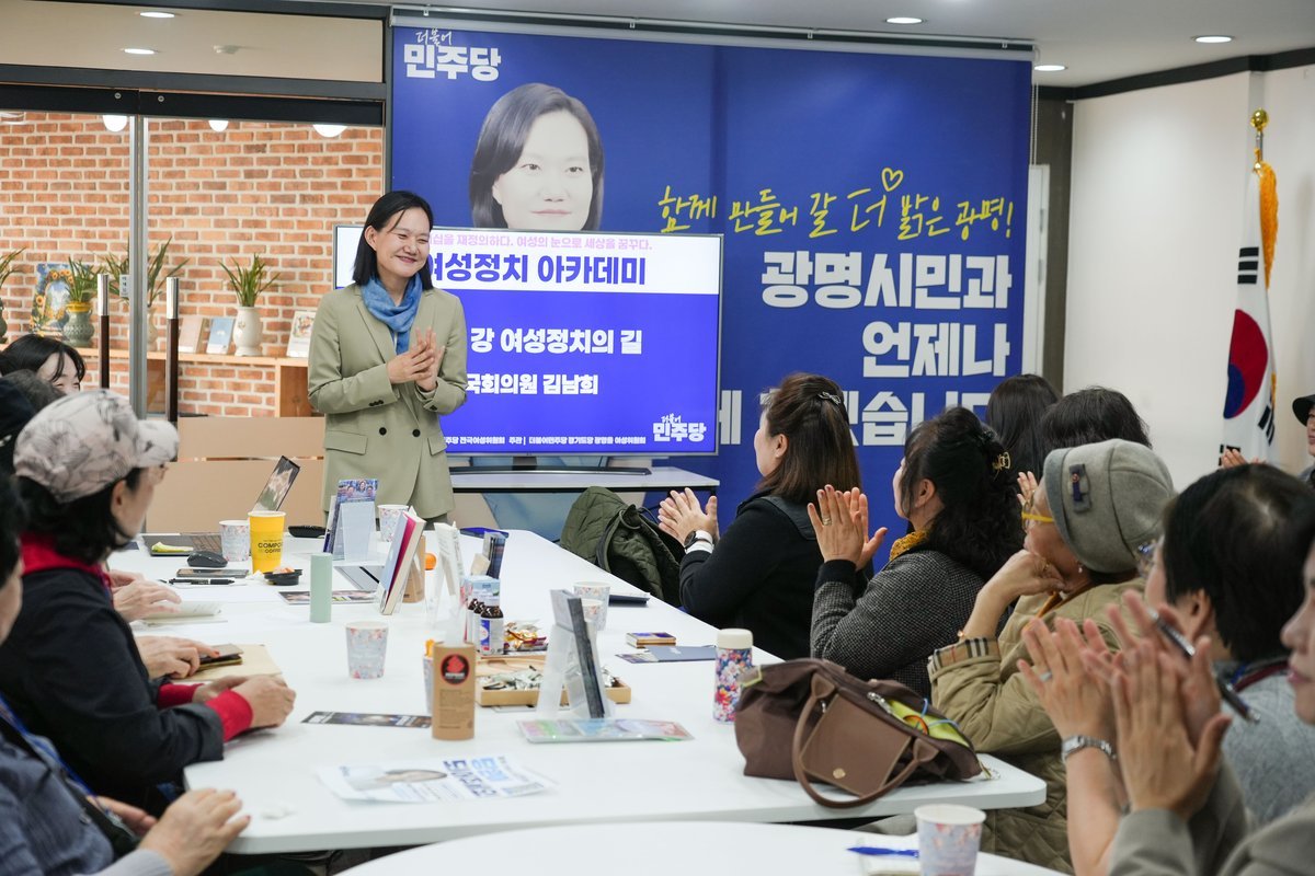 김남희의원실 (국회 제공) [PEDIEN] 더불어민주당 김남희 의원이 여성 정치 참여 확대를 위해 주력해 온 교육 프로그램인 ‘여성정치아카데미’가 성황리에 개막했다.이번 아카데미는 더불어민주당 전국여성위원회 공모사업에 선정됐으며 경기도당 광명을 여성위원회 주관으로 김 의원 지역구에서 처음으로 개최됐다.행사는 14일과 15일 이틀간 광명을 지역사무실에서 진행된다.김남희 의원은 국회 여성가족위원회에서 활동하며 여성·성평등 정책을 꾸준히 다뤄왔으며 이재명 대통령 직속 국정기획위원회 위원으로 참여해 관련 정책을 국정과제에 반영하는 데 기여했다.특히 성평등가족부로 확대·개편 과정에서도 핵심 역할을 맡아 제도 설계와 방향 설정에 힘써왔다.또한 지난달 여성 인권 및 정책 발전에 기여한 공로로 2025 양성평등정책대상 특별상을 수상한 바 있으며 최근 당 전국여성위원회 산하 여성리더십셉터 소장으로 임명되어 여성·성평등 정책 강화와 리더십 양성에 힘쓰고 있다.행사의 첫 강의는 김 의원이 직접 진행한 ‘여성정치의 길’특강으로 문을 열었다.김 의원은 강연에서 △정치를 시작한 이유 △여성 정치인의 강점과 약점 △정치를 준비하는 여성들을 위한 실질적 조언 등을 자신의 경험과 노하우를 담아 설명했다.특강에서 김 의원은 “여성은 아직 정치의 영역에서 충분히 참여하지 못하고 있다”며 “앞으로 여성정치는 반드시 더 발전할 것이라 믿는다”고 밝혔다.이어 “모두가 존엄하게 살아가는 사회를 만들기 위해 여성들이 서로 연대해 더 좋은 정치를 만들어 가겠다”고 강조했다.이번 여성정치아카데미는 여성 리더십을 주제로 여성들의 정치 참여를 확장하고 각자가 지닌 고유의 역량과 리더십을 발견하고 이끌어낼 수 있도록 돕는 교육 프로그램이다.이를 통해 광명 지역 여성들이 정치와 정책 과정에 보다 적극적으로 참여하는 기반이 마련될 것으로 기대된다. -