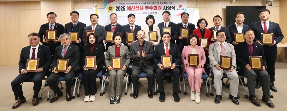 경기도의회 국민의힘, 2025 예산심사 우수의원 시상 (경기도의회 제공) [PEDIEN] 경기도의회 국민의힘이 2025년도 예산 심사에서 뛰어난 활약을 보인 의원 21명을 선정하여 시상했다.이번 시상식은 이한국 수석정책위원장의 사회로 진행되었으며, 백현종 대표의원과 이용호 총괄수석부대표가 참석하여 자리를 빛냈다. 각 상임위원회에서 추천받은 의원들은 예산 심사 과정에서 탁월한 성과를 인정받았다.수상자는 기획재정위원회 이혜원·김정호 의원, 경제노동위원회 남경순 의원, 안전행정위원회 임상오·김규창 의원, 문화체육관광위원회 유영두·조희선 의원, 농정해양위원회 방성환 의원, 보건복지위원회 고준호·김완규 의원, 건설교통위원회 허원·안명규 의원, 도시환경위원회 김시용 의원, 미래과학협력위원회 이제영·심홍순 의원, 여성가족평생교육위원회 김민호·김정영 의원, 교육기획위원회 이택수·임광현 의원, 교육행정위원회 이애형·김영기 의원 등이다.백현종 대표의원은 쉴 틈 없이 예산 심사에 매진한 의원들의 노고에 감사를 표했다. 그는 도민의 삶을 개선하고 경기도의 밝은 미래를 만들어나가는 데 더욱 힘써줄 것을 당부하며, 앞으로도 강력한 추진력과 실행력을 보여주기를 기대한다고 밝혔다. -