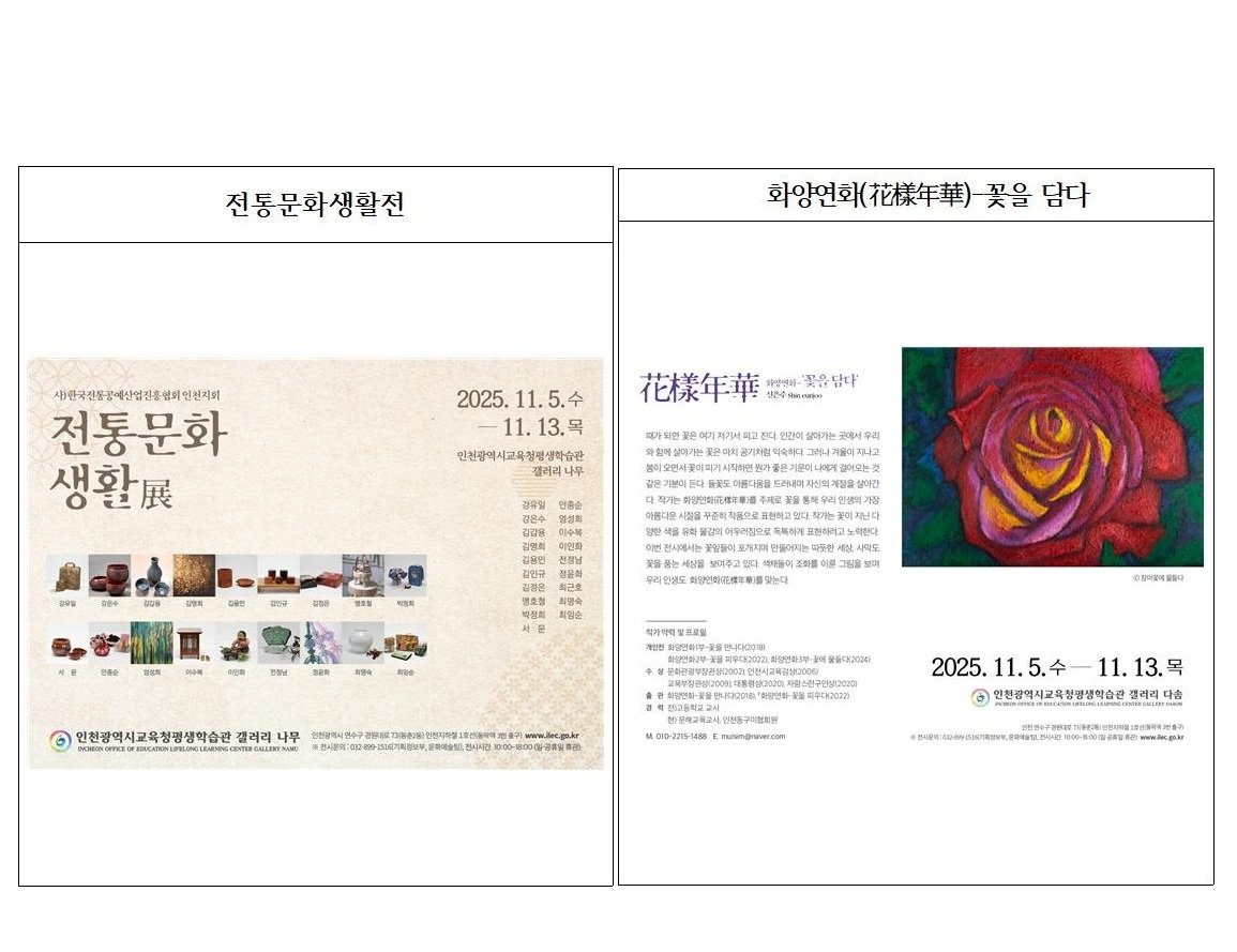 인천광역시교육청평생학습관 11월 ‘전통문화생활전’ 및 ‘화양연화(花樣年華)-꽃을 담다’ 전시 [PEDIEN] 인천광역시교육청평생학습관이 11월, 시민들을 위한 특별한 문화 행사로 '전통문화생활전'과 '화양연화(花樣年華) - 꽃을 담다' 전시를 동시에 개최한다.이번 전시는 전통 공예의 아름다움과 인생의 가장 빛나는 순간을 예술로 승화시킨 작품들을 선보이며, 시민들에게 풍성한 볼거리를 제공할 예정이다.갤러리 나무에서는 '전통문화생활전'이 열린다. 이 전시는 전통 공예의 가치를 재조명하고, 그 아름다움을 시민들과 공유하기 위해 마련됐다.전통적인 기법과 현대적인 감각이 어우러진 다양한 공예 작품들을 통해, 우리 문화의 깊이와 아름다움을 느낄 수 있는 기회가 될 것으로 보인다.갤러리 다솜에서는 '화양연화(花樣年華) - 꽃을 담다' 전시가 진행된다. 이 전시는 꽃을 다양한 색채와 형태로 표현하여, 인생의 가장 아름다운 순간을 되돌아보는 시간을 선사한다.화려하고 섬세한 꽃 그림들을 통해, 삶의 긍정적인 에너지와 희망을 얻을 수 있을 것으로 기대된다.두 전시는 11월 5일부터 13일까지 평생학습관 2층 갤러리 나무와 다솜에서 오전 10시부터 오후 6시까지 무료로 관람할 수 있다. 단, 일요일과 공휴일은 휴관한다.이번 전시를 통해 인천 시민들이 전통문화와 예술을 더욱 가까이에서 접하고, 삶의 여유와 즐거움을 느낄 수 있기를 바란다. -