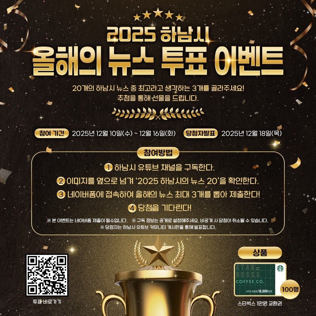 시민과 함께 돌아보는 2025 하남 … ‘올해의 10대 뉴스’온라인 투표 시작 (하남시 제공) [PEDIEN] 하남시가 2025년 시정 주요 뉴스를 시민과 함께 선정하는 온라인 투표를 12월 10일부터 16일까지 진행한다.이번 투표는 시민의 시각으로 하남시의 한 해를 되돌아보고, 시민들의 의견을 시정에 반영하기 위해 마련됐다.투표 참여 방법은 간단하다. 하남시청 홈페이지, 유튜브, 인스타그램 등에서 링크 또는 QR코드를 통해 투표 페이지에 접속, 유튜브 구독 인증 후 20개 뉴스 후보 중 3개를 선택하면 된다.시는 투표 참여자 중 100명을 추첨하여 1만원 상당의 커피 상품권을 지급하는 이벤트도 진행한다.시는 투표 결과를 향후 정책 우선순위 결정 및 시민 체감도 파악에 활용할 계획이라고 밝혔다.선정 결과는 12월 18일 하남시 공식 유튜브와 인스타그램을 통해 공개될 예정이다. 시는 이번 투표를 통해 시민과의 소통을 강화하고, 시민 중심의 정책을 추진해나갈 방침이다. -