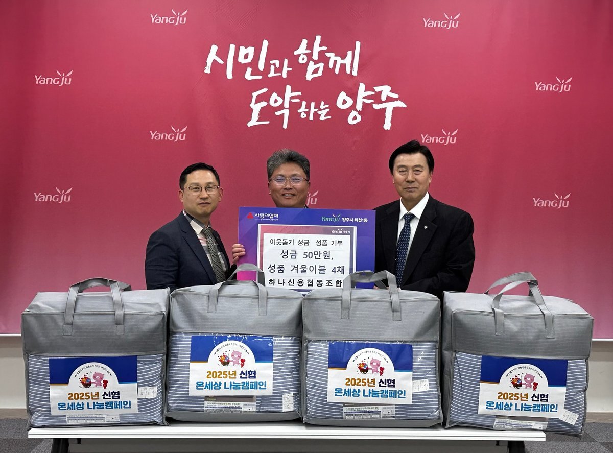 -하나신협 회천1동에 이웃돕기 성금과 성품 전달 (양주시 제공) [PEDIEN] 하나신협이 회천1동 주민들을 위해 따뜻한 나눔을 실천했다.하나신협은 17일 회천1동 행정복지센터에 성금 50만원과 겨울 이불 4채를 전달하며 훈훈함을 더했다. 이번 기부는 경제적으로 어려움을 겪는 이웃들에게 따뜻한 겨울을 선물하기 위해 마련됐다.하나신협은 평소에도 지역사회를 위한 꾸준한 기부활동을 이어오고 있다. 소외계층을 위한 나눔을 통해 지역사회 발전과 이웃사랑을 몸소 실천하는 모습이다.이번에 기탁된 성금은 사회복지공동모금회를 통해 회천1동 내 취약계층 복지사업에 사용될 예정이다. 또한, 겨울 이불은 독거노인, 장애인 등 경제적 어려움을 겪는 주민들에게 전달될 계획이다.김중열 하나신협 이사장은 “작은 정성이지만 어려움을 겪는 이웃들에게 따뜻한 위로와 희망이 되기를 바란다”며, “기탁한 성금과 성품이 꼭 필요한 분들에게 잘 전달되기를 희망한다”고 밝혔다.이성철 회천1동장은 “지난해에 이어 올해도 저소득층을 위한 나눔을 실천해주셔서 진심으로 감사드린다”며, “기부해주신 성금과 성품은 복지 취약계층을 위해 소중하게 사용하겠다”고 화답했다. -