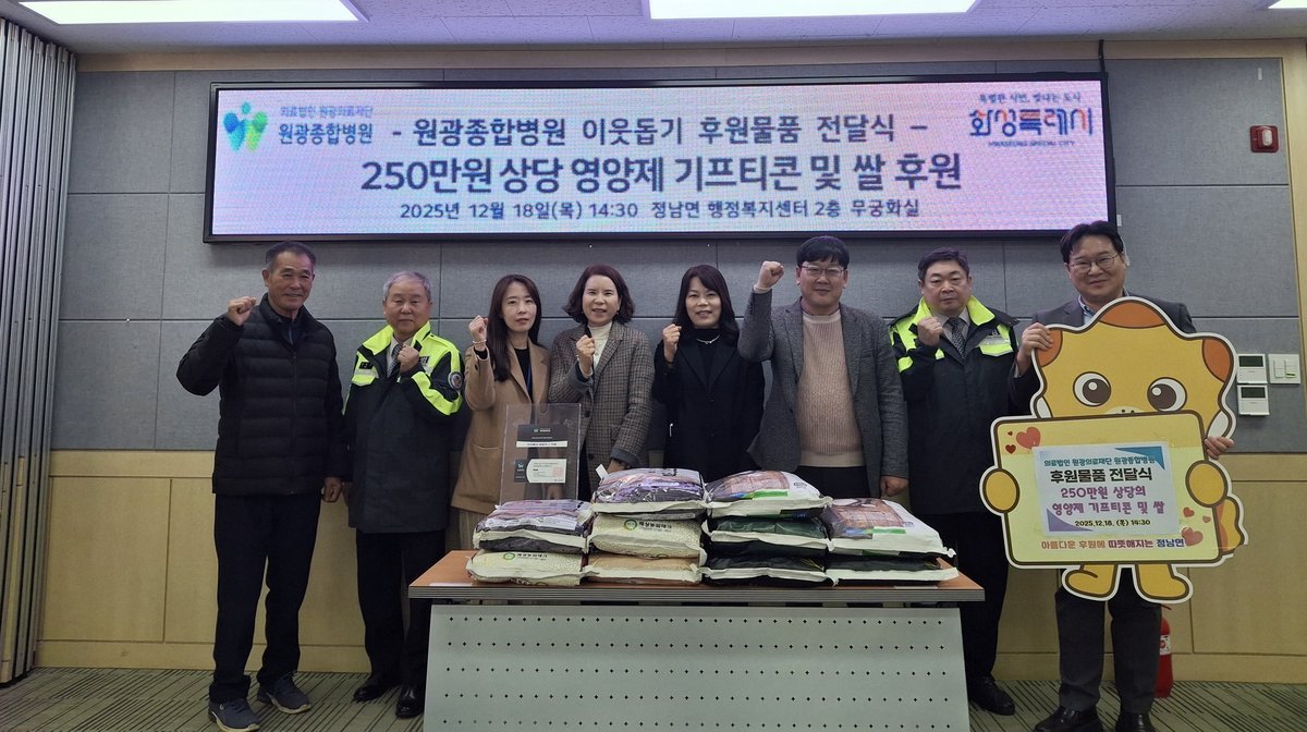 원광종합병원, 화성특례시 정남면에 취약계층 위한 250만 원 상당 면역증강 영양주사 쿠폰 및 쌀 기탁 (화성시 제공) [PEDIEN] 원광종합병원이 화성시 정남면의 어려운 이웃들을 위해 250만원 상당의 면역 증강 영양주사 쿠폰과 쌀을 기탁하며 따뜻한 나눔을 실천했다.이번 기탁은 이경환 병원장의 취임을 기념하여 지역 거점 의료기관으로서 사회적 책임을 다하고, 건강 관리에 취약한 어르신들의 면역력 향상과 건강 증진을 돕기 위해 마련되었다.원광종합병원은 정남면 지역사회보장협의체와 협력하여, 관내 취약계층 어르신 20명에게 기탁된 물품을 전달할 예정이다.박천권 원광종합병원 관리이사는 이경환 병원장의 취임을 맞아 병원이 지역사회와 더욱 긴밀하게 소통하고 사회적 책임을 다하고자 이번 나눔을 준비했다고 밝혔다. 그는 앞으로도 지역 주민의 건강을 지키는 것은 물론, 어려운 이웃과 함께하는 다양한 사회공헌 활동을 지속적으로 펼쳐나갈 것을 약속했다.조성하 정남면장은 원광종합병원의 따뜻한 나눔에 깊은 감사를 표하며, 기탁된 물품이 필요한 어르신들에게 소중하게 전달되어 건강하고 따뜻한 겨울을 보내실 수 있도록 하겠다고 전했다.원광종합병원은 지역 주민의 건강 증진을 위한 의료 서비스 제공과 더불어, 나눔과 상생을 실천하는 다양한 사회공헌 활동을 통해 지역사회와의 동반 성장을 꾸준히 이어갈 계획이다. -