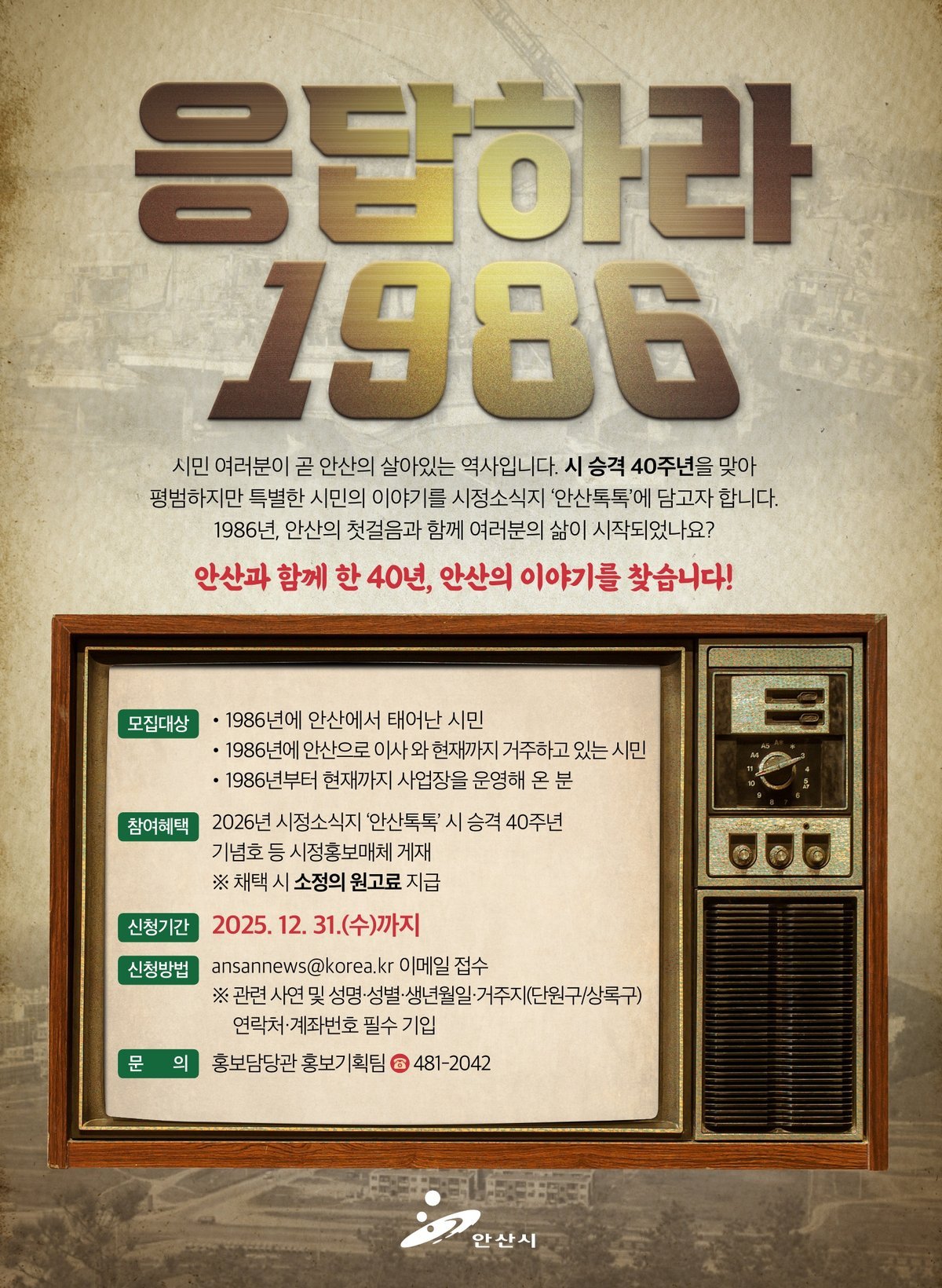 안산시, 시 승격 40주년 맞아 시민 이야기 사연 공모 (안산시 제공) [PEDIEN] 안산시가 시 승격 40주년을 기념하여 시민들의 사연을 공개 모집한다.이번 공모는 1986년부터 안산과 함께 해온 시민들의 삶을 기록하고, 이를 시정 소식지 '안산톡톡'에 담아 시민이 곧 안산의 살아있는 역사임을 알리기 위해 기획됐다.모집 대상은 1986년 안산에서 태어난 시민, 1986년 안산으로 이주하여 현재까지 거주하는 시민, 그리고 1986년부터 현재까지 안산에서 사업장을 운영해 온 시민이다.시는 시민들의 평범한 일상 속 추억부터 지역과 함께한 특별한 순간까지 다양한 이야기를 발굴할 계획이다.사연 접수는 연말까지 전자우편을 통해 진행되며, 내부 검토를 거쳐 최종 사연을 선정한다.선정된 시민의 이야기는 내년 발행 예정인 '안산톡톡' 시 승격 40주년 기념호와 다양한 시정 홍보 매체에 활용될 예정이다. 사연 채택 시 소정의 원고료도 지급된다.이민근 시장은 “안산의 변화와 성장을 함께해 온 시민 한 분 한 분의 이야기가 곧 안산의 생생한 역사”라며 시민들의 많은 관심과 참여를 당부했다.이번 사연 공모를 통해 안산시는 과거와 현재, 미래를 잇는 의미 있는 기록 활동을 추진할 것으로 전망된다.