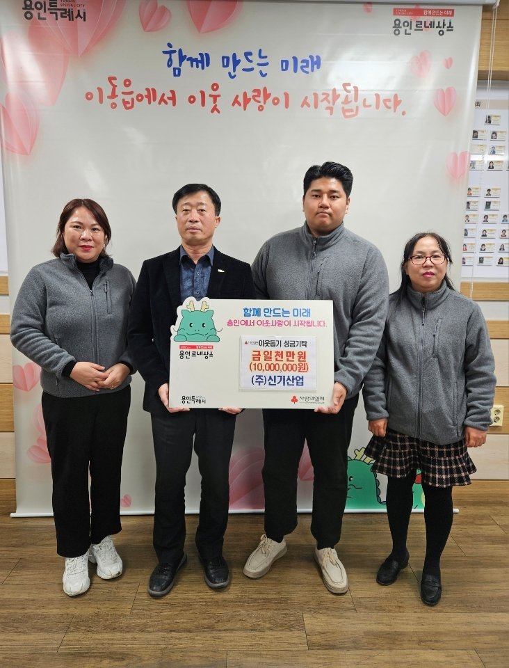 ㈜신기산업, 이동읍에 1000만 원 기탁 (용인시 제공) [PEDIEN] 용인특례시 이동읍에 위치한 ㈜신기산업이 지역 내 어려운 이웃들을 위해 따뜻한 나눔을 실천했다.㈜신기산업은 사회복지공동모금회를 통해 이동읍의 취약계층 지원을 위한 성금 1000만원을 기탁했다고 15일 밝혔다.이번 기탁은 ㈜신기산업이 오랫동안 이어온 사회공헌 활동의 일환으로, 기업의 사회적 책임을 다하는 모범적인 행보로 평가받고 있다.㈜신기산업 김 대표는 “기탁된 성금이 지역 주민들의 삶을 실질적으로 개선하는 데 사용되기를 바란다”며 “지역민과 함께 따뜻한 연말을 만들어가고 싶다”고 소감을 밝혔다.기탁된 성금은 이동읍의 취약계층을 위한 다양한 복지사업에 폭넓게 활용될 예정이다.특히 겨울철 취약계층의 생활 안정, 아동 및 청소년 돌봄, 긴급 지원 등 도움이 필요한 곳에 우선적으로 배분될 계획이다.용인시는 ㈜신기산업의 꾸준한 나눔 활동이 지역사회에 긍정적인 영향을 미치고, 나눔 문화 확산에 기여할 것으로 기대하고 있다. -