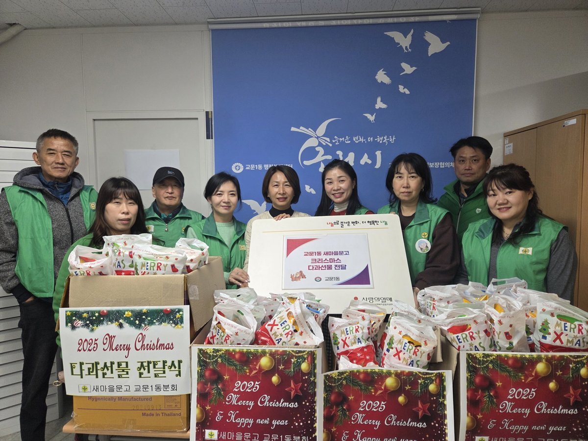 [PEDIEN] 구리시 교문1동 새마을문고가 크리스마스를 맞아 지역 아동센터 아이들에게 따뜻한 마음을 전했다.새마을문고는 지난 12월 18일, 관내 3개 지역아동센터에 크리스마스 다과 선물 세트를 전달하는 행사를 가졌다. 이번 선물은 아이들이 즐거운 연말을 보내도록 새마을문고 회원들이 정성껏 준비했다.교문1동 새마을문고는 올해 지역 아동센터를 대상으로 다양한 독서 장려 활동을 펼쳐왔다. 분기별 다독왕 시상, 순환 도서 배달 등을 통해 아이들의 독서 습관 형성과 문화 정서 함양에 힘썼다.특히 김서윤 통장의 도움으로 운영되는 '딸기원 작은도서관'을 통해 순환 도서 배달 사업을 꾸준히 이어가고 있다.황의순 새마을문고 회장은 “크리스마스를 맞아 아이들에게 따뜻한 마음을 전하고 싶었다”며, “앞으로도 아이들이 밝고 건강하게 성장할 수 있도록 독서 문화 확산 활동을 지속적으로 추진할 계획”이라고 밝혔다.이진수 교문1동장은 “지역 아동들을 위한 새마을문고의 지속적인 지원과 봉사에 감사드린다”며, “아이들이 꿈과 희망을 키워갈 수 있는 따뜻한 교문1동을 만들어나가겠다”고 말했다.