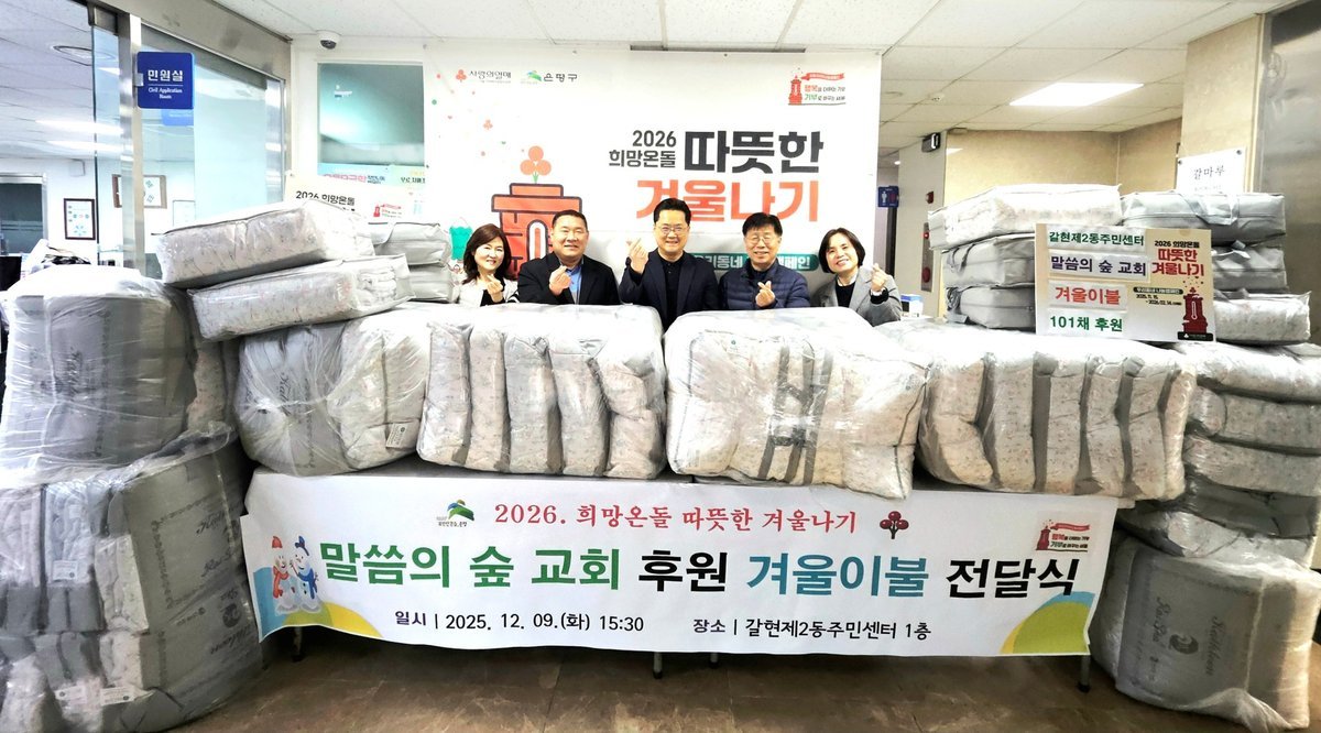 갈현2동, 말씀의 숲 교회 사랑의 겨울이불 기부 - 관내 복지사각지대 및 저소득 취약계층에 겨울이불 101채 기부 (은평구 제공) [PEDIEN] 서울 은평구 갈현2동이 말씀의 숲 교회로부터 겨울 이불 101채를 기부받았다고 10일 밝혔다. 이번 기부는 ‘2026 따뜻한 겨울나기 사랑의 성품’의 일환으로 진행됐다.말씀의 숲 교회는 매년 성도들의 정성을 모아 어려운 이웃을 위한 겨울 이불을 지원해왔다. 올해는 특히 고물가 시대에 더욱 어려움을 겪는 취약계층을 위해 따뜻한 마음을 전하고자 했다.교회는 2023년 35채, 2024년 50채, 2025년 100채에 이어 올해 101채까지 꾸준히 기부를 이어오고 있다.기부받은 이불은 갈현2동 관내 복지 사각지대에 놓인 저소득 취약계층에게 전달될 예정이다.김기성 말씀의 숲 교회 목사는 “작은 정성이지만 추운 겨울 어려움을 겪는 이웃들에게 따뜻함으로 전해지길 바란다”며 “앞으로도 지속적인 나눔을 통해 지역사회에 기여하겠다”고 밝혔다.이보경 갈현2동장은 “어려운 경제 상황 속에서도 매년 나눔 활동에 적극적으로 참여해주시는 말씀의 숲 교회에 깊이 감사드린다”고 전했다. -