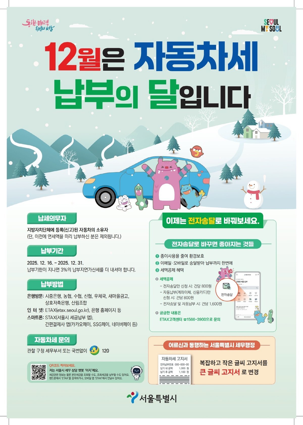 구로구, 2025년 하반기 자동차세 “12월 31일까지 납부하세요” (구로구 제공) [PEDIEN] 구로구가 2025년 하반기 자동차세 납부 기간을 12월 16일부터 31일까지 운영한다.구로구에 등록된 자동차, 이륜차, 건설기계 소유자는 12월 1일까지 자동차세를 납부해야 한다. 단, 2025년 연세액을 미리 납부한 경우에는 해당하지 않는다.납부 기한을 넘길 경우 3%의 납부지연가산세가 부과되므로, 반드시 12월 31일까지 납부해야 한다.구로구는 납세자 편의를 위해 다양한 납부 방식을 제공한다. 고지서에 기재된 전용 계좌로 송금하거나, 서울시 세금납부 앱, 서울시 지방세 온라인 납부 시스템을 이용할 수 있다. 또한 자동응답시스템 1599-3900을 통해 납부하거나, 직접 은행을 방문하여 납부하는 방법도 있다.만약 고지서를 분실했다면 구청 지방소득세과 또는 가까운 동 주민센터에서 즉시 재발급받을 수 있다.구로구청은 납부 마감일에는 금융기관 업무량 증가와 인터넷 접속 지연이 발생할 수 있으므로, 미리 납부할 것을 권장한다. 자동차세 관련 문의는 구로구청 지방소득세과 또는 징수과에서 안내받을 수 있다. -