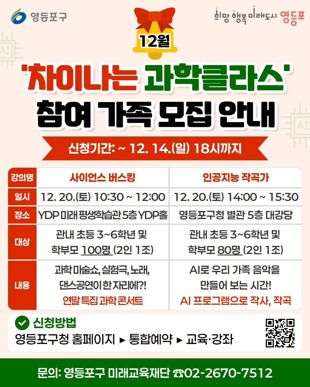 연말, 가족과 함께하는 과학공연ㆍ체험…영등포구, ‘차이나는 과학클라스’참가자 모집 (영등포구 제공) [PEDIEN] 영등포구 산하 영등포구 미래교육재단이 연말을 맞아 온 가족이 함께 참여하는 과학문화 특별프로그램 ‘차이나는 과학클라스’의 참가자를 모집한다고 밝혔다.이번 프로그램은 다양한 공연과 체험을 통해 학부모와 자녀가 함께 참여하며 특별한 연말 추억을 만들 수 있도록 기획됐다.△과학 마술·실험극·댄스 공연으로 구성된 과학 콘서트 ‘사이언스 버스킹’△작사·작곡을 직접 체험하는 ‘인공지능 작곡가’2개 프로그램이 마련됐으며, 오는 12월 20일 운영된다.‘사이언스 버스킹’에는 과학 퍼포머 이나영, 과학 커뮤니케이터 서진, 이세리가 참여해 △액체질소를 활용한 과학 퍼포먼스 △야광눈 만들기 △요술풍선 쇼 △과학노래로 배우는 과학 원리 △실험과 안무가 결합된 댄스 공연 등 풍성한 볼거리를 선보인다.‘인공지능 작곡가’는 김태훈 과학커뮤니케이터가 강연자로 참여해 △인공지능을 활용한 가사 만들기 △자동 작곡 프로그램으로 ‘우리 가족 노래’완성하기 등 흥미로운 체험을 제공한다.관내 초등학교 3~6학년 자녀 1명과 학부모 1명이 1팀으로 신청해야 하며, ‘사이언스 버스킹’은 50팀, ‘인공지능 작곡가’는 40팀을 모집한다.오는 12월 14일까지 영등포구 누리집 통합예약시스템에서 신청할 수 있으며 참가자는 추첨을 통해 선정된다.한편, ‘차이나는 과학클라스’는 로봇, 미래 에너지, 천문, 인공지능 등 다양한 과학 분야를 주제로 올해 7개 과정이 진행돼 533명이 참여했다.일상 속에서 과학을 만나고 세대 간 지식 교류와 협력을 통해 교육 효과를 높이는 프로그램으로 큰 호응을 얻고 있다.영등포구 미래교육재단 관계자는 “공연·체험·창작을 결합한 특별한 연말 과학문화 프로그램을 마련했다”라며 “앞으로도 아이들의 과학적 호기심을 키우고 미래 역량 향상에 도움이 되는 교육 콘텐츠를 지속적으로 선보이겠다”라고 전했다. -