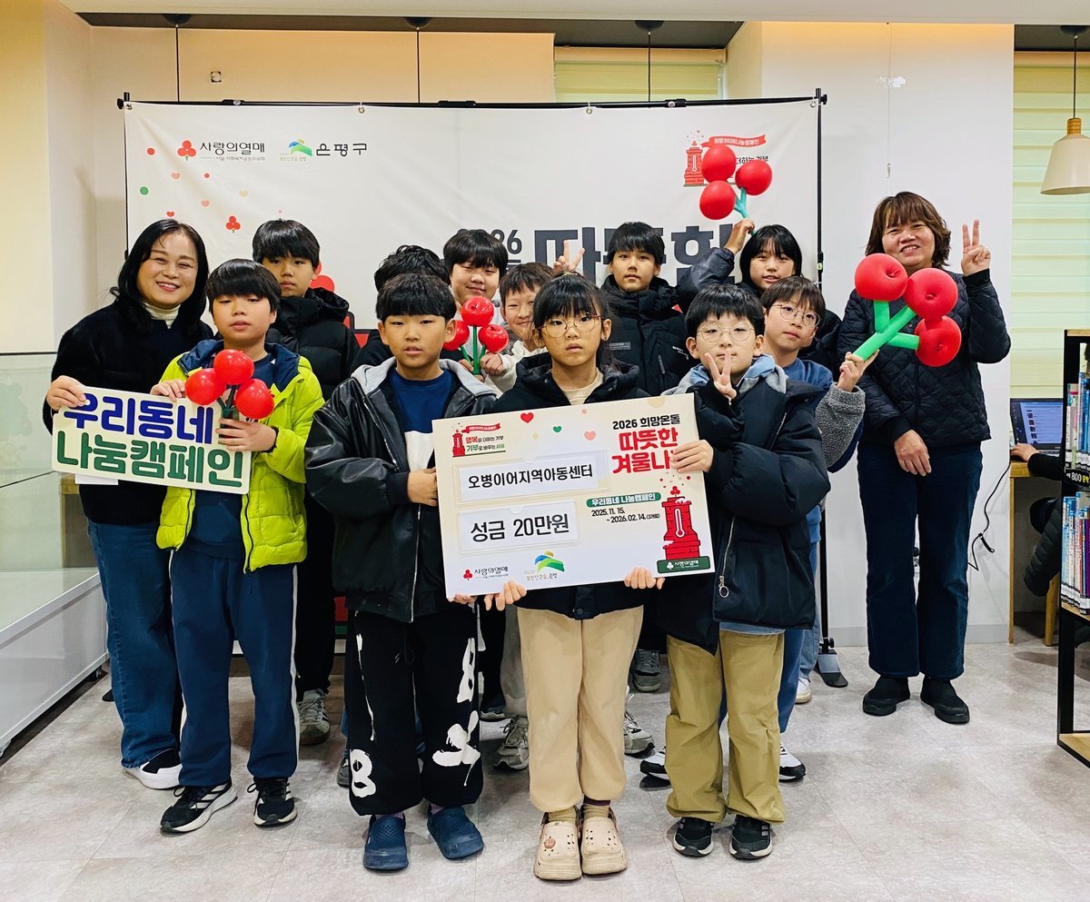응암1동, 오병이어지역아동센터와 함께하는 사랑의 성금기탁 (은평구 제공) [PEDIEN] 서울 은평구 응암1동에 따뜻한 나눔의 손길이 전해졌다. 오병이어지역아동센터가 지난 20일, 어려운 이웃을 위한 성금 20만원을 2026 희망온돌 따뜻한 겨울나기 사업에 기탁하며 훈훈함을 더했다.이번 성금은 응암1동 관내 독거노인과 중장년 1인가구 등, 겨울철 도움이 절실한 취약계층 주민들에게 전달될 예정이다. 추운 겨울, 따뜻한 온정을 나누는 데 의미를 더한다.오병이어지역아동센터는 평소에도 지역 아동들을 위한 교육 및 돌봄 프로그램을 꾸준히 운영하며 지역사회와 적극적으로 소통하고 있다. 나눔 활동을 지속적으로 실천하며 사회공헌에 앞장서고 있다.차숙자 오병이어지역아동센터 대표는 “아이들과 함께 지역 내 어려운 이웃들에게 작지만 따뜻한 마음을 전달하고 싶었다”며 성금 기탁의 배경을 밝혔다. 이어 “아이들의 마음이 잘 전달되기를 바라며, 앞으로도 지역사회와 함께 따뜻한 공동체를 만들어나가는 데 힘을 보탤 것”이라고 덧붙였다.유경숙 응암1동장은 “매년 지역사회를 위해 나눔을 실천해주시는 오병이어지역아동센터에 깊은 감사를 드린다”고 말했다. 또한 “전달된 성금은 도움이 필요한 분들에게 소중하게 전달될 수 있도록 최선을 다하겠다”고 밝혔다. -