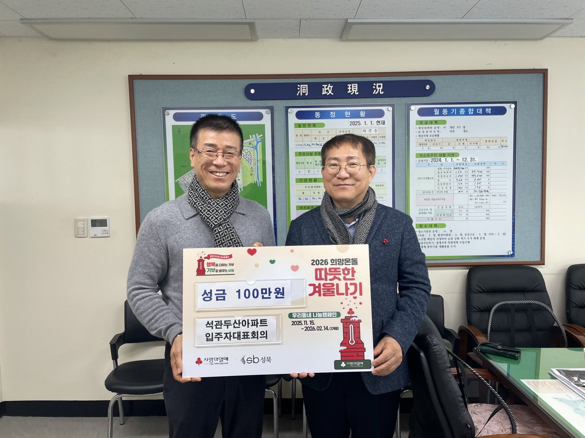 성북구 석관동 두산아파트 입주자대표회의, 올겨울도 이웃돕기 성금 전달 (성북구 제공) [PEDIEN] 성북구 석관동 두산아파트 입주자대표회의가 변함없는 이웃사랑을 실천하며, 15년째 따뜻한 나눔을 이어가고 있다.입주자대표회의는 최근 '2026년 희망온돌 따뜻한 겨울나기' 사업에 동참, 어려운 이웃을 위한 성금 100만원을 석관동에 기탁했다.이번 성금은 추운 겨울, 경제적 어려움을 겪는 취약계층의 생활 안정에 쓰일 예정이다.석관동 두산아파트의 나눔은 2011년부터 시작되어 올해로 15년째 지속되고 있다. 아파트 공동체 중심의 꾸준한 기부는 지역사회에 따뜻한 온기를 불어넣고 있다.임채현 입주자대표회의 회장은 "주민들의 작은 정성이 어려운 이웃들에게 따뜻한 위로가 되기를 바란다"며, "앞으로도 지역사회와 함께하는 공동체로서 나눔을 꾸준히 실천하겠다"고 밝혔다.전영훈 석관동장은 "오랜 기간 변함없이 이웃사랑을 실천하는 석관동 두산아파트 입주자대표회의에 깊이 감사드린다"며, "전달된 성금은 도움이 필요한 이웃들에게 소중하게 전달하겠다"고 말했다.석관동 두산아파트의 지속적인 나눔은 단순한 기부를 넘어, 지역사회 공동체 의식을 높이고 훈훈한 정을 나누는 모범 사례로 평가받고 있다. -