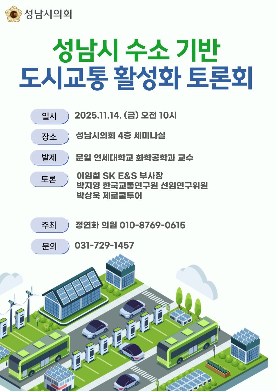 토론회 웹자보 (성남시 제공) [PEDIEN] 성남시의회 정연화 의원은 최근 열린 성남사송 액화수소충전소 개소식에 참석해 관계자들로부터 액화수소 충전에 대한 설명을 듣고 올해 출시된 현대자동차의 12m 수소버스를 시승했다.해당 차량은 경기도 최초의 12m 수소버스로 친환경 대중교통의 새로운 전환점을 상징한다.정 의원은 시승 후 “수소버스의 승차감이 매우 우수했다”며 소음이 적고 매연 냄새가 나지 않아 쾌적했으며 함께 탑승자 중 한 분은 ‘하늘에 떠 있는 듯한 부드러운 승차감’이라고 표현할 정도였다”고 소감을 전했다.또한 충전소 관계자들은 “액화수소의 충전 효율이 높아 버스의 경우 약 30분, 승용차는 15분이면 완충이 가능해 기존 충전 인프라 대비 대기 시간이 크게 줄었다”고 설명했다.정 의원은 “이러한 기술력은 시민의 이동 편의를 높이는 동시에 온실가스 감축에도 기여할 것”이라며 “기후위기 시대에 수소 교통은 선택이 아닌 필수”고 강조했다.정연화 의원은 “성남시가 친환경 교통의 중심 도시로 도약하기 위해서는 수소충전소 확충과 더불어 수소버스 등 공공교통의 확대가 중요하다”고 밝히며 “시민이 체감할 수 있는 지속가능한 교통정책을 적극적으로 뒷받침하겠다”고 덧붙였다. -