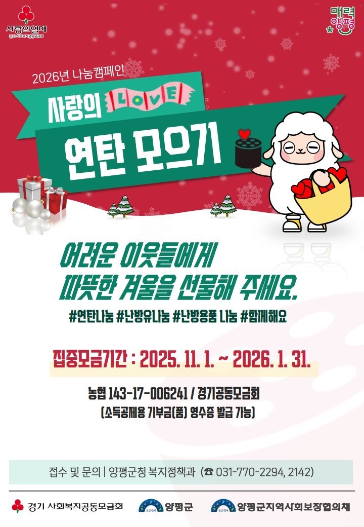 사랑의_연탄_모으기_운동_리플릿 (사진제공=양평군) [PEDIEN] 양평군이 2025년 사랑의 연탄 모으기 운동을 시작해 관내 어려운 이웃들의 따뜻한 겨울나기를 지원한다.이번 운동은 난방비 부담으로 힘든 저소득 가구에 연탄, 난방유, 난방용품 등을 지원하는 사업이다.최근 에너지 비용 상승과 물가 인상으로 취약계층의 어려움이 더욱 커지고 있어 이번 운동의 의미가 깊다.지난해에는 주민들과 기관, 단체의 적극적인 참여로 2억 2천만원 상당의 성금과 물품이 모였다.이를 통해 1,233가구에 연탄과 난방유, 난방용품 등이 지원됐다.전진선 양평군수는 어려운 이웃들의 겨울 걱정을 덜어주기 위해 군민들의 많은 관심과 참여를 부탁했다.군민들의 작은 정성이 모여 큰 온기를 만들 수 있다는 점을 강조했다.사랑의 연탄 모으기 운동은 1월 31일까지 진행되며 모금된 성금과 물품은 경기사회복지공동모금회를 통해 양평군에 배분된다.기부자에게는 기부금 영수증이 발급되어 연말정산 시 소득공제 혜택을 받을 수 있다.자세한 사항은 양평군청 복지정책과에 문의하면 된다. -