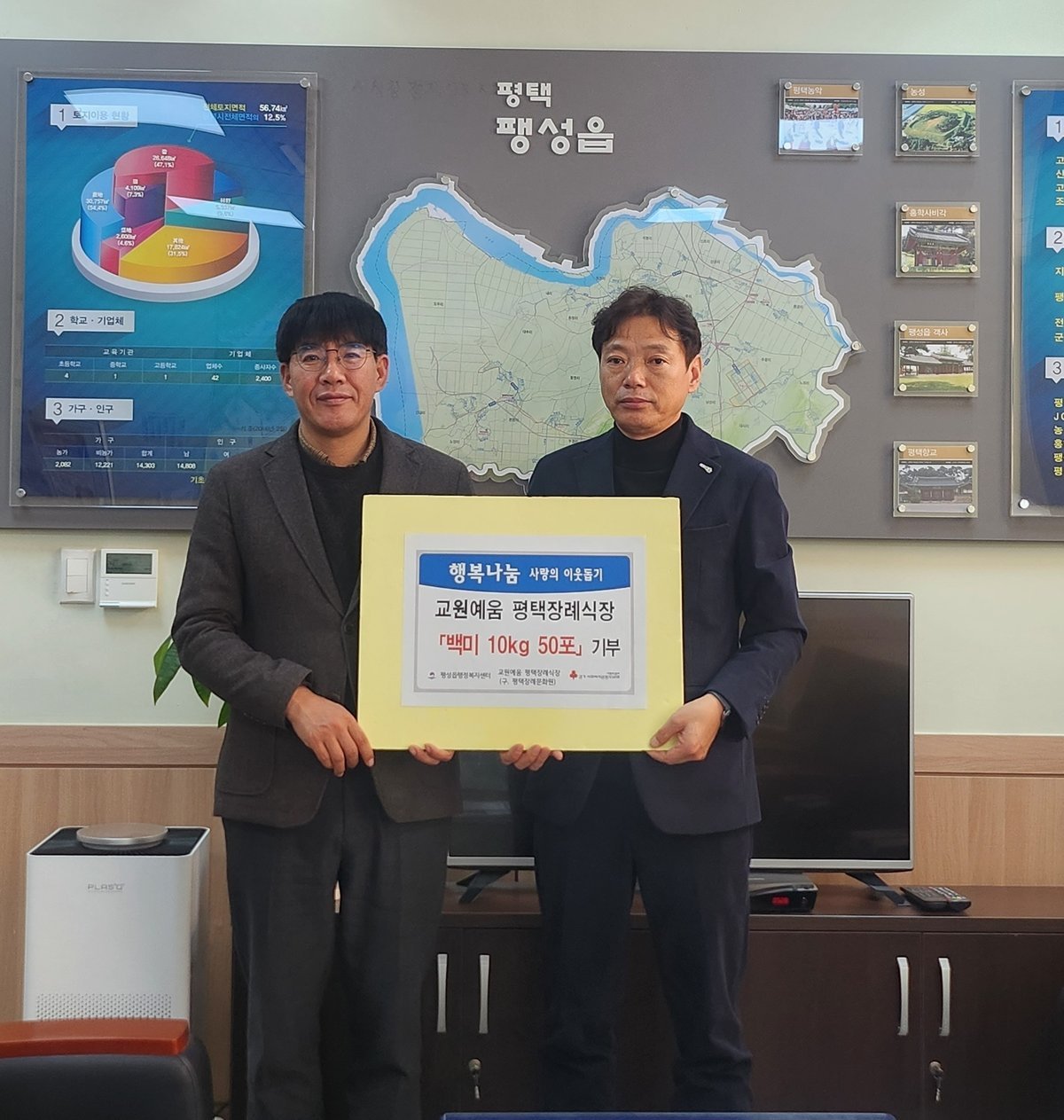교원예움 평택장례식장, 연말 맞아 백미 50포 기부 (평택시 제공) [PEDIEN] 평택시에 있는 교원예움 평택장례식장은 지난 18일, 팽성읍 행정복지센터를 방문해 지역의 어려운 이웃에게 전달해 달라며 백미 50포를 기부했다.교원예움 평택장례식장은 매년 연말 지역사회 나눔 활동을 꾸준히 이어오며 이웃사랑 나눔 문화 확산에 앞장서고 있다.또한 평소에도 지역주민과의 소통과 협력 강화를 위한 다양한 사회공헌 활동을 실천해 지역사회의 모범이 되고 있다.이날 전달식에서 교원예움 홍대성 사무장은 “장례를 마주하는 많은 순간 속에서 어려운 이웃에 대한 관심과 배려의 중요성을 다시금 느끼게 된다”며 “앞으로도 지역사회에 보탬이 될 수 있는 나눔 활동을 지속하겠다”라고 말했다.이에 이근영 팽성읍장은 “어려운 이웃을 위해 소중한 물품을 기부하신 교원예움 평택장례식장에 깊이 감사드린다”라며 “기부받은 백미는 관내 취약계층 가구에 잘 전달해 따뜻한 겨울을 보낼 수 있도록 하겠다”라고 전했다. -