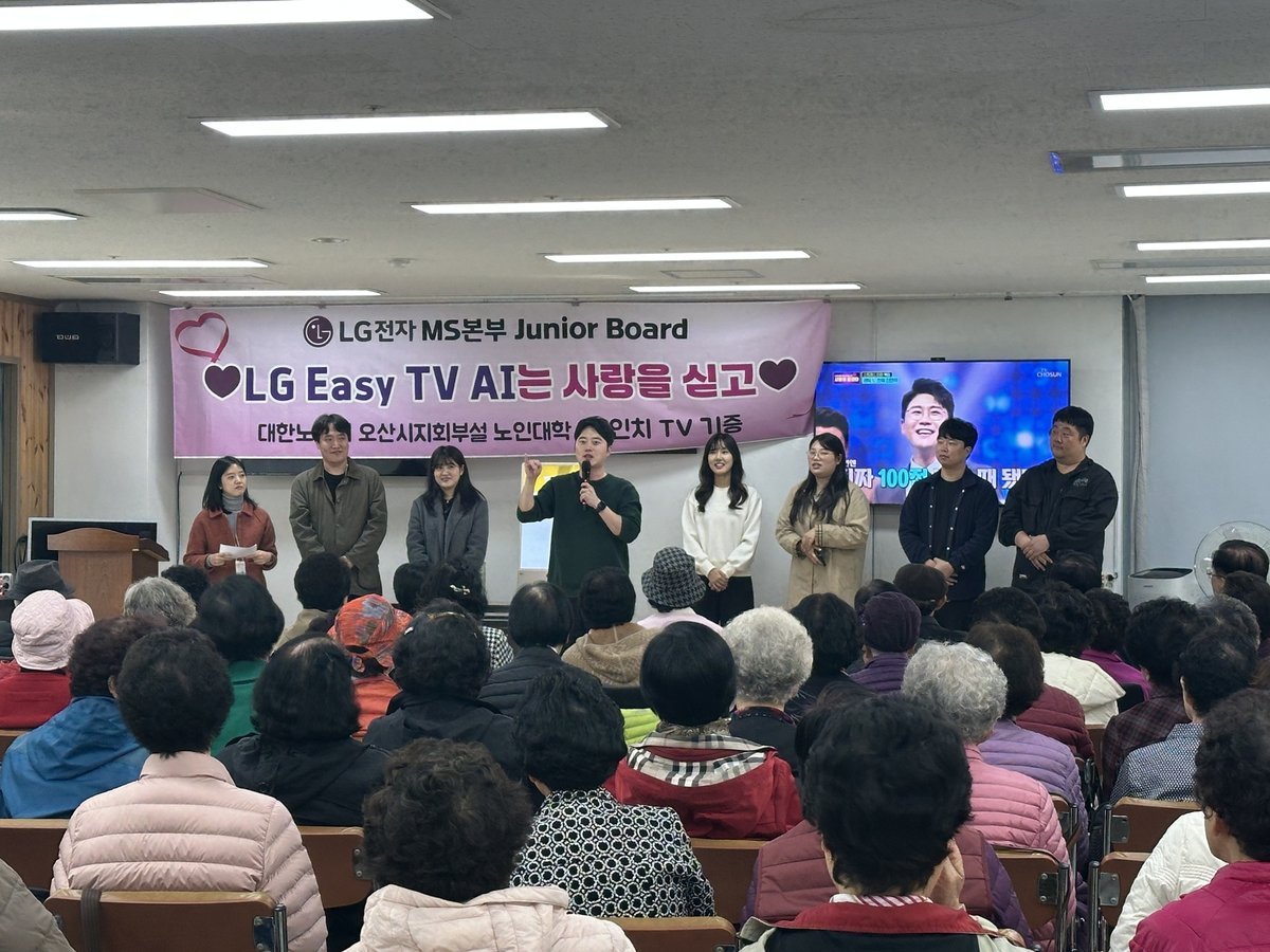 LG전자 MS본부 주니어보드 오산노인대학에 시니어 맞춤형 TV 스피커 기부 (오산시 제공) [PEDIEN] LG전자 MS본부 주니어보드가 오산노인대학에 시니어 맞춤형 TV 1대와 블루투스 스피커 2대를 기증하며 따뜻한 나눔을 실천했다.이번 기증은 단순한 물품 전달을 넘어, 어르신들의 디지털 활용 능력을 높이는 데 기여하고자 마련되었다.기증식에는 오산노인대학 교양강좌 수강생 100여 명과 대한노인회 오산시지회장이 참석하여 감사를 표했다. LG전자 MS본부 주니어보드 대표단은 직접 방문하여 시니어 전용 TV 조작법을 안내하고 교육용 키오스크 활용 체험 프로그램을 진행하며 큰 호응을 얻었다.오산노인대학 학장은 시니어TV를 활용한 사진 촬영, 간단한 게임, 영상 통화 기능 시연에 감사를 표하며, 노인대학 프로그램이 더욱 다양해질 것으로 기대한다고 밝혔다.LG전자 MS본부 주니어보드는 사내 조직문화 활동뿐 아니라 지역사회를 위한 사회공헌활동을 꾸준히 이어오고 있다. 이번 기증 외에도 오산노인대학 환경정화활동을 함께 진행하며 나눔의 의미를 더했다.오산노인대학은 대한노인회 오산시지회 부속기관으로, 35년간 어르신들의 평생교육과 교류의 장 역할을 수행하고 있다. 올해는 보이스피싱 예방 교육, 노래 교실, 동아리반 등 다채로운 프로그램을 운영하며 어르신들의 활기찬 노년 생활을 지원하고 있다.