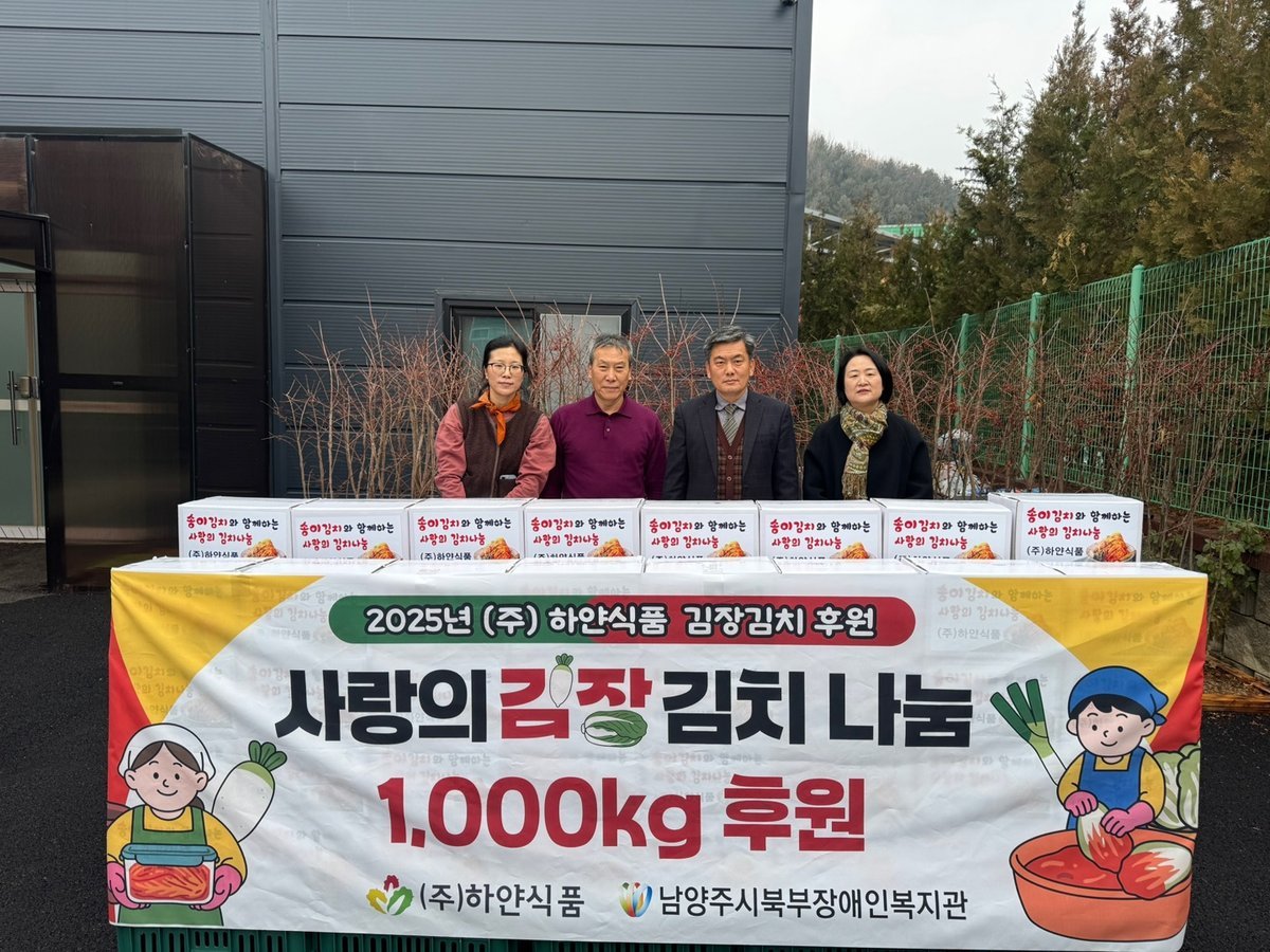 남양주시북부장애인복지관, 취약계층 장애인에 ㈜하얀식품 후원 김장김치 1000KG 전달 (남양주시 제공) [PEDIEN] ㈜하얀식품이 남양주시북부장애인복지관에 김장김치 1000kg을 후원하며 따뜻한 나눔을 실천했다.이번 후원은 겨울철 생계에 어려움을 겪는 취약계층 장애인 가정을 돕기 위해 마련됐다. 하얀식품은 지난해에 이어 올해도 김장김치를 후원하며 지역사회와의 상생을 이어가고 있다.전달식은 남양주시북부장애인복지관에서 진행되었으며, 김장김치는 지역 내 장애인 가정 143세대에 전달될 예정이다.장유라 하얀식품 대표는 “작은 정성이지만 어려운 이웃들이 따뜻한 겨울을 보내는 데 도움이 되길 바란다”며 지속적인 사회공헌 활동을 약속했다.남양주시는 하얀식품의 후원에 감사를 표하며, 민관 협력을 통해 장애인 복지 향상을 위해 노력할 것을 밝혔다.김남국 북부장애인복지관장은 “하얀식품의 따뜻한 나눔이 겨울철 어려움을 겪는 장애인 가정에 큰 힘이 될 것”이라며 감사의 뜻을 전했다.복지관은 앞으로도 지역사회와 협력하여 취약계층 장애인을 위한 복지사업을 확대하고, 나눔 문화 확산에 기여할 계획이다. -