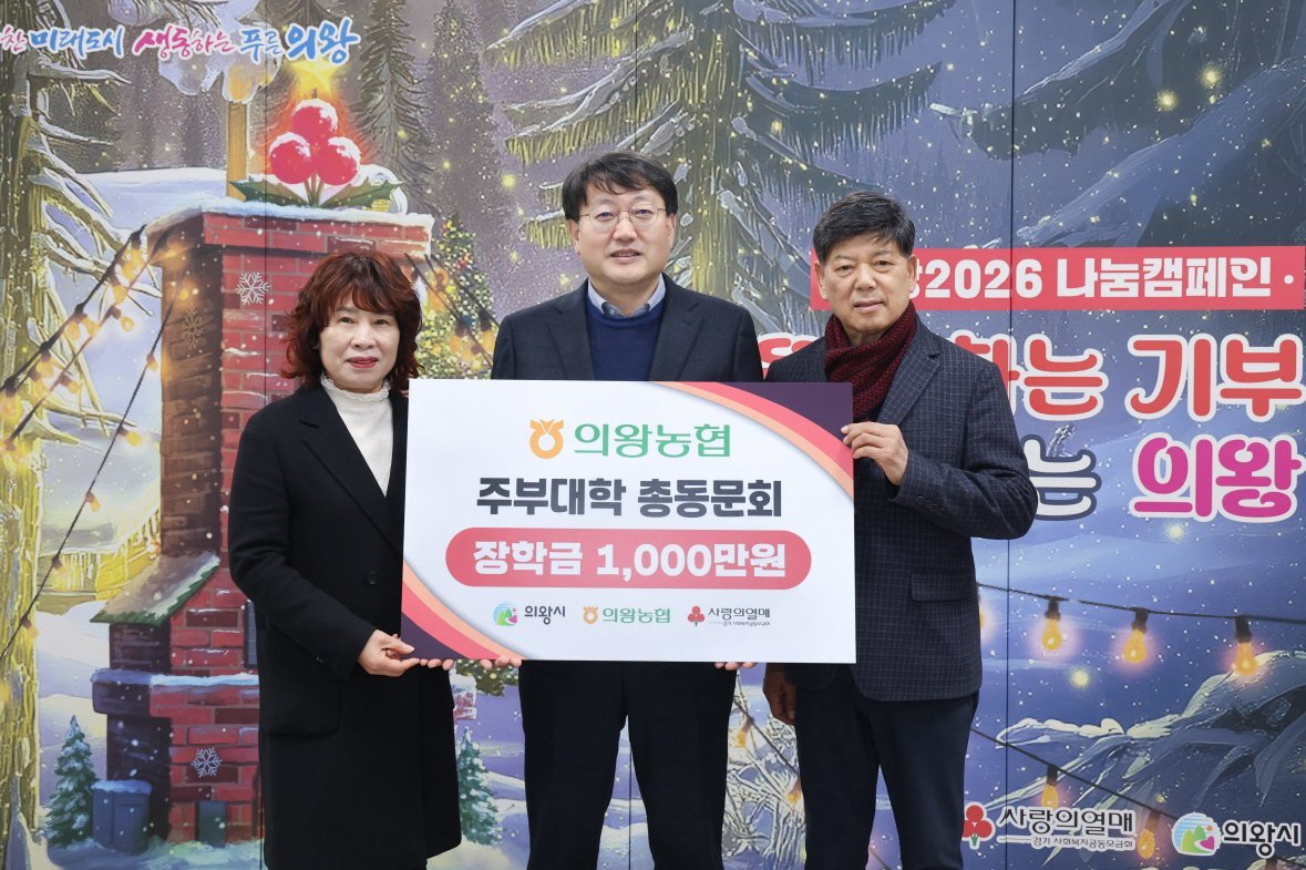 의왕농협주부대학 총동문회, 의왕시에 장학금 1000만원 기부 (의왕시 제공) [PEDIEN] 의왕농협주부대학 총동문회가 18일, 의왕시에 장학금 1000만원을 기부하며 지역 사회에 따뜻한 온정을 전했다.이번 장학금은 의왕시 관내 초중고등학생 22명에게 전달될 예정이다. 의왕시청 로비에서 진행된 장학금 전달식에는 김경자 의왕농협주부대학 총동문회장을 비롯해 이응천 의왕농협 조합장 등 관계자 11명이 참석했다.김경자 총동문회장은 학생들이 꿈을 키우는 데 조금이나마 도움이 되기를 바라는 마음으로 회원들과 뜻을 모아 장학금을 기탁하게 되었다고 밝혔다. 더불어 앞으로도 지역사회와 함께하는 나눔 활동을 지속적으로 펼쳐나갈 것을 약속했다.이응천 의왕농협 조합장은 주부대학 동문들의 자발적인 나눔이 지역사회에 큰 울림을 줄 것이라고 기대하며, 의왕농협 또한 지역 인재 육성과 상생 발전을 위해 다양한 사회공헌 활동을 꾸준히 이어나갈 계획이라고 전했다.안치권 의왕시 부시장은 총동문회의 따뜻한 나눔에 깊은 감사를 표하며, 학생들이 장학금을 통해 꿈을 실현하고 미래에 지역사회에 기여하는 인재로 성장하기를 바란다고 말했다.한편, 의왕농협주부대학 총동문회는 매년 장학금을 지원하며 지역사회 나눔을 꾸준히 실천하고 있다. -