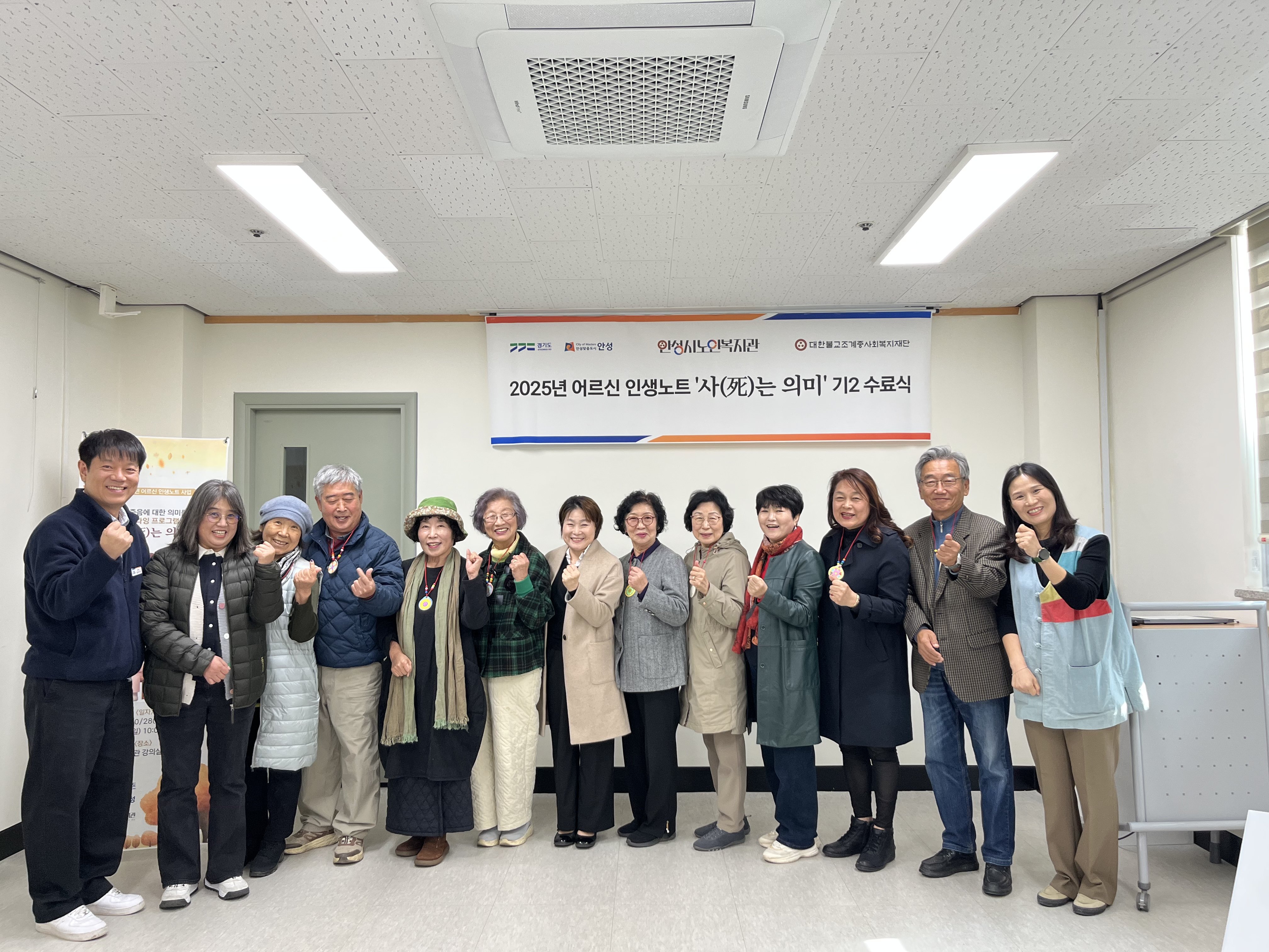 노인돌봄 2기 수료식 (안성시 제공) [PEDIEN] 안성시노인복지관이 경기도 웰다잉 문화 조성 사업의 일환으로 진행한 '2025년 어르신 인생노트 사업 ‘사는 의미’ 2기'프로그램을 성공적으로 마무리했다.이번 프로그램은 고령 인구 증가 추세에 맞춰 어르신들에게 정서적 안정과 자아 성찰의 기회를 제공하고자 기획됐다.안성시는 '안성시 2025년 어르신 인생노트'사업 수행기관으로 선정되어 어르신들의 웰에이징 및 웰다잉을 위한 교육 프로그램을 운영했다.지난 8월 26일부터 11월 4일까지 총 10회에 걸쳐 진행된 이번 프로그램은 자서전 쓰기, 버킷리스트 작성, 삶의 의미 탐색, 가족 관계 회복 등 다양한 활동으로 구성됐다.특히 '과거로의 여행'을 주제로 한 청춘사진 촬영과 자연 속 치유 활동은 참여자들의 큰 호응을 얻었다.프로그램에 참여한 어르신들은 지난 삶을 되돌아보며 배우는 시간을 가졌다고 소감을 밝혔다.또한 인생노트를 통해 평소 전하지 못했던 마음을 표현하며 부부 관계가 더욱 돈독해졌다는 의견도 있었다.안성시노인복지관 가섭 관장은 인생을 되돌아보는 기록들이 어르신들의 삶을 더욱 빛나게 할 것이라고 전했다.더불어 삶의 마무리는 현재를 충실히 살아가는 과정임을 강조하며 앞으로도 어르신들의 인생 여정에 함께할 것을 약속했다. -