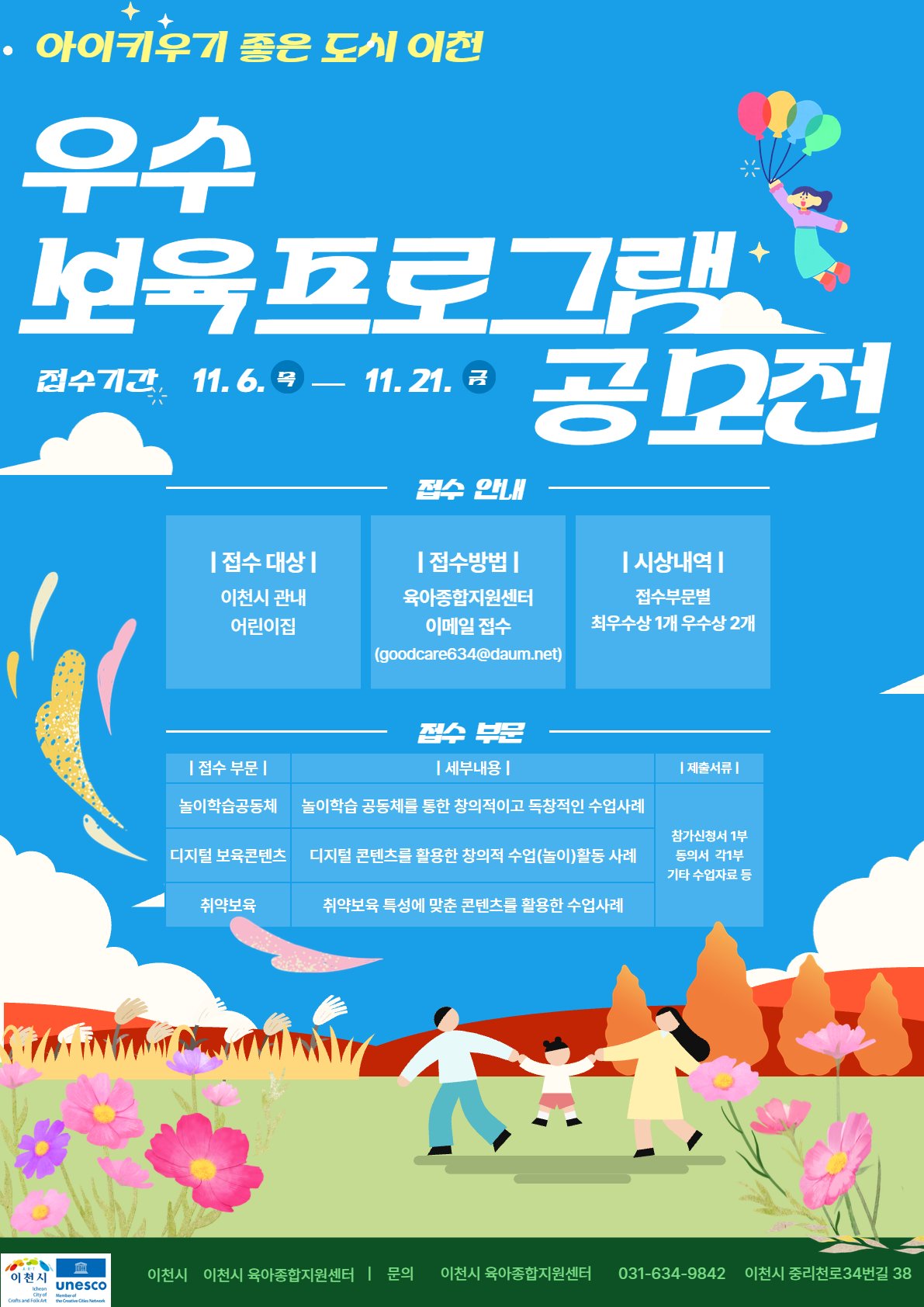 이천시 2025년도 우수보육프로그램 공모전 개최 [PEDIEN] 이천시가 2025년 우수보육프로그램 공모전을 개최하여 관내 어린이집의 창의적인 보육 프로그램 발굴에 나선다.이천시육아종합지원센터 주관으로 진행되는 이번 공모전은 놀이학습공동체, 디지털보육컨텐츠, 취약보육 총 3개 부문으로 구성된다.접수 기간은 2025년 11월 6일부터 11월 21일까지이며, 심사를 거쳐 12월 중 입상작을 발표할 예정이다.김경희 이천시장은 아이들의 성장과 발달을 위한 다양한 보육 콘텐츠 개발의 중요성을 강조하며, 이번 공모전이 우수 프로그램 확산의 계기가 되기를 바란다고 밝혔다.또한, 앞으로도 행복한 보육환경 조성을 위해 지속적으로 노력할 것을 약속했다.백소영 이천시육아종합지원센터장은 이번 공모전을 통해 다양한 보육 콘텐츠가 발굴 및 개발될 수 있도록 교육 서비스와 지원을 강화해 나갈 계획임을 전했다.이천시는 이번 공모전을 통해 아이, 부모, 교사 모두가 행복한 보육 도시를 만들어나가는 데 기여하고, 가정 양육 지원 및 어린이집 운영 환경 개선을 위한 노력을 지속적으로 이어갈 방침이다. -