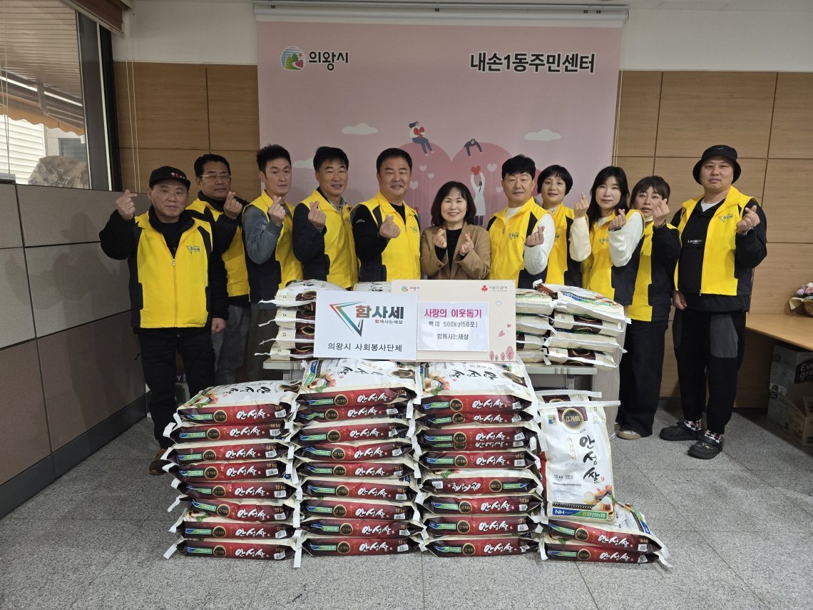의왕시 함께사는세상, 연말 맞아 내손1동에 따뜻한 온정 전해 (의왕시 제공) [PEDIEN] 의왕시 함께사는세상은 지난 12월 10일 지역의 어려운 이웃을 돕기 위해 10kg 쌀 50포를 내손1동 주민센터에 기탁했다.함께사는세상은 그동안 소외계층을 위한 봉사와 후원을 꾸준히 이어오고 있는 단체로 이번 쌀 기탁 또한 취약계층 가구의 식생활을 지원하고, 생활 부담을 조금이나마 덜어주기 위한 취지에서 추진됐다.기탁된 쌀은 내손1동 주민센터를 통해 겨울철 난방·식비 부담이 큰 지역 내 취약계층 가구를 중심으로 신속하게 지원될 예정이다.황기동 함께사는세상 회장은 “작은 나눔이지만 어려운 이웃에게 따뜻한 위로가 되길 바라는 마음으로 기부 물품을 준비했다”며“앞으로도 이웃과 지역사회가 서로를 더 따뜻하게 보듬을 수 있도록 꾸준히 나눔 활동을 이어가겠다”고 말했다.김정애 내손1동장은 “따뜻한 마음을 전해주신 함께사는세상에 깊이 감사드린다”며“기탁된 물품은 필요한 이웃에게 소중히 전달하겠다”고 말했다. -
