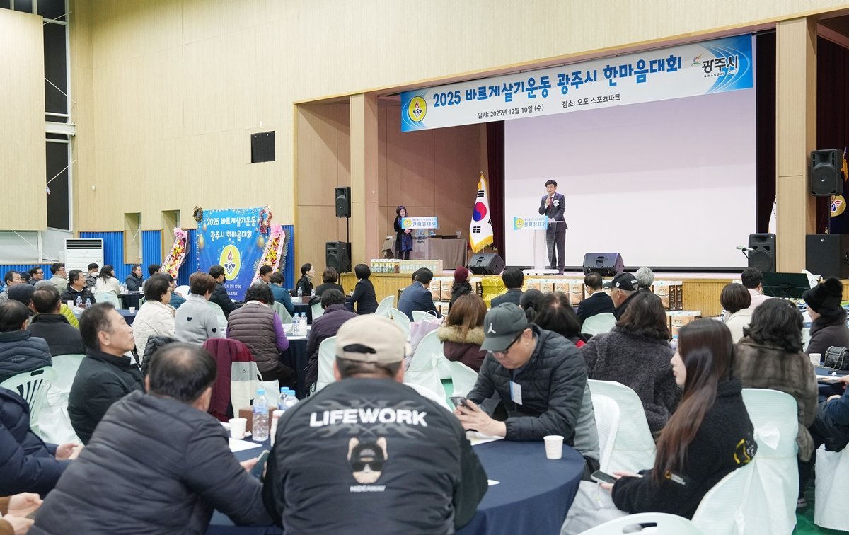 바르게살기운동 광주시협의회 한마음대회 성료 광주시 제공 [PEDIEN] 바르게살기운동 광주시협의회가 10일 오포스포츠파크에서 '2025 한마음대회'를 성황리에 개최했다.이번 행사에는 방세환 광주시장을 비롯해 각급 기관·단체장과 협의회 회원 200여 명이 참석하여 자리를 빛냈다.행사는 2025년 활동 성과 영상 시청을 시작으로 대회사, 격려사, 축사, 유공자 표창, 결의문 낭독, 회가 제창 순으로 진행됐다. 특히, 한 해 동안 지역사회 곳곳에서 나눔과 봉사를 실천한 회원들의 노고를 격려하는 뜻깊은 시간으로 채워졌다.김성수 협의회장은 “올 한 해 소외된 이웃과 지역 발전을 위해 묵묵히 봉사해 주신 회원들에게 깊은 감사를 드린다”며, “앞으로도 공동체의 안전과 행복을 위해 적극적으로 역할을 다하겠다”고 강조했다.방세환 시장은 “1998년 바르게살기운동 창립 이후 27년 넘게 진실·질서·화합의 정신을 실천하며 태극기 게양 홍보, 방범 활동, 환경정화, 이웃돕기 등을 통해 지역사회에 크게 기여했다”고 평가했다. 덧붙여 “이번 대회를 계기로 회원들이 더욱 단합해 건강하고 따뜻한 광주시를 만드는 데 함께해 주시길 바란다”고 당부했다.바르게살기운동 광주시협의회는 진실·질서·화합의 3대 이념을 바탕으로 지역사회의 건전한 가치 확립과 나눔 문화 확산을 위해 다양한 봉사활동을 지속적으로 추진할 계획이다. -