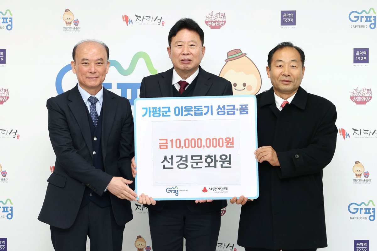 선경문화원, 가평군에 성금 1천만원 기부 (가평군 제공) [PEDIEN] 선경문화원이 11일 가평군청에 지역 내 소외계층을 위한 성금 1천만원을 전달하며 따뜻한 나눔을 실천했다.이날 전달식에는 이주석 원장을 비롯한 선경문화원 관계자들이 참석하여 나눔의 의미를 되새기고, 향후 지역 복지 발전을 위한 협력 방안을 논의했다. 선경문화원은 지역 문화 및 교육 활동을 중심으로 꾸준히 사회공헌 활동을 펼쳐왔으며, 특히 매년 취약계층을 위한 성금 기부를 통해 지역사회 복지 증진에 기여하고 있다.이주석 원장은 “지역 주민들과 함께 성장해 온 기관으로서 지역사회에 도움이 될 수 있는 나눔을 꾸준히 이어가고자 한다”며 “작은 정성이지만 꼭 필요한 분들에게 보탬이 되기를 바란다”고 전했다.서태원 가평군수는 “매년 잊지 않고 따뜻한 손길을 전해주시는 선경문화원에 깊이 감사드린다”며 “기탁해 주신 성금은 가평군 취약계층 지원에 소중하게 활용하겠다”고 밝혔다.선경문화원의 지속적인 나눔 활동은 지역사회에 훈훈한 온기를 불어넣고 있으며, 앞으로도 다양한 사회공헌 활동을 통해 지역사회 발전에 기여할 것으로 기대된다. -