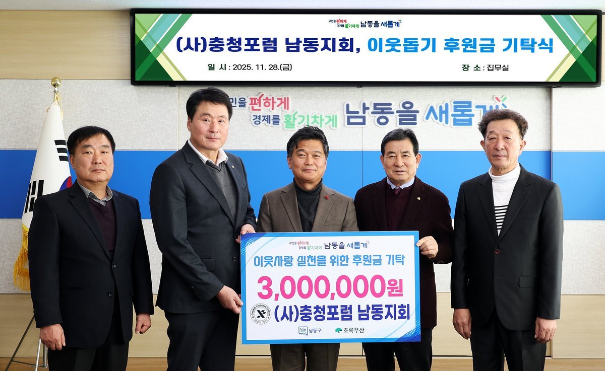 충청포럼 남동지회, 이웃돕기 후원금 기탁 (남동구 제공) [PEDIEN] 충청포럼 남동지회가 인천 남동구의 어려운 이웃을 위해 따뜻한 마음을 전했다.충청포럼 남동지회는 2일, 남동구에 이웃돕기 후원금 300만원을 기탁하며 지역사회 나눔에 앞장섰다.이번 후원금은 초록우산 어린이재단을 통해 남동구 취약계층 아동 가구의 겨울철 난방비 지원에 사용될 예정이다.충청포럼 남동지회는 2022년부터 꾸준히 지역사회를 위한 나눔 활동을 이어오고 있다.한광인 회장은 “작은 정성이지만 지역사회에 따뜻한 온기를 전하고 싶었다”며, 앞으로도 도움이 필요한 이웃과 함께하겠다는 뜻을 밝혔다.박종효 남동구청장은 충청포럼 남동지회의 지속적인 관심과 나눔에 감사를 표하며, 기탁금을 소중하게 사용하겠다고 약속했다.충청포럼 남동지회는 기부자 명예의 전당 서포트 그룹에 등재된 단체로, 저소득 학생 장학금 지원 등 꾸준한 나눔을 실천하며 지역사회 공동체 조성에 기여하고 있다. -
