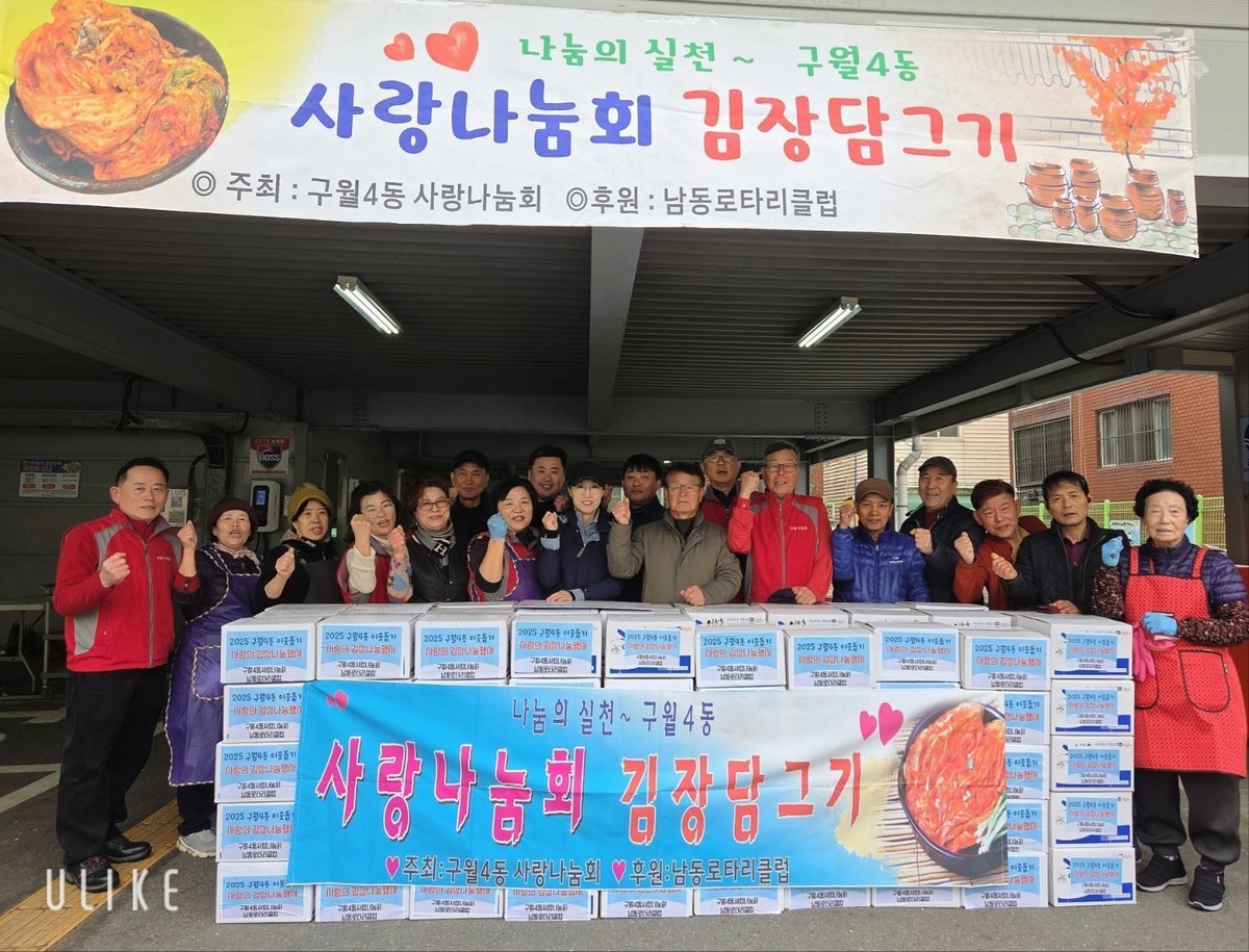 구월4동 사랑나눔회, 사랑의 김장 나눔 행사 개최 (남동구 제공) [PEDIEN] 인천 남동구 구월4동 사랑나눔회가 남동로타리클럽의 지원을 받아 '사랑의 김장 나눔 행사'를 열고, 지역 내 어려운 이웃들에게 따뜻한 마음을 전했다.사랑나눔회 회원 22명은 정성껏 담근 김장 김치를 결식이 우려되는 어르신 100세대에 직접 전달하며 훈훈한 온정을 나눴다.소공자 사랑나눔회장은 남동로타리클럽과의 협력을 통해 어려운 이웃들이 따뜻한 겨울을 보내도록 김장을 준비했다고 밝혔다. 그는 앞으로도 지역 사회에 도움이 될 수 있도록 지속적인 나눔 활동을 펼칠 것을 약속했다.이윤정 구월4동장은 사랑나눔회와 남동로타리클럽에 감사의 뜻을 전하며, 동에서도 취약계층 주민들이 따뜻하게 겨울을 날 수 있도록 지속적인 관심과 지원을 아끼지 않겠다고 말했다. 동은 앞으로도 방문 상담과 안부 전화 등을 통해 어르신들을 살뜰히 보살필 계획이다.이번 김장 나눔 행사는 지역 사회의 따뜻한 정을 나누는 뜻깊은 행사로, 추운 겨울을 앞둔 이웃들에게 큰 힘이 될 것으로 기대된다. -