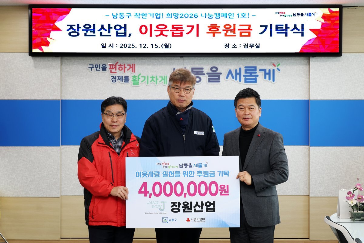 장원산업, 남동구 이웃돕기 후원금 400만 원 기탁 (남동구 제공) [PEDIEN] 인천 남동구에 위치한 장원산업이 사회복지 시설 및 단체 지원을 위해 400만원의 후원금을 기탁하며 따뜻한 나눔을 실천했다.이번 후원금은 남동구의 복지 사각지대에 놓인 주민들과 사회적 취약계층을 지원하는 다양한 사업에 사용될 예정이다.장원산업은 2022년부터 3년간 꾸준히 지역사회 나눔을 실천하며 장애인, 여성 시설, 청소년 쉼터 등에 기부를 이어왔다.이러한 공헌을 인정받아 인천사회복지공동모금회가 선정한 '우리 구 착한 기업'과 '희망 2026 나눔 캠페인' 남동구 1호점으로 선정되는 영예를 안았다.이재호 장원산업 대표이사는 지역사회와 함께 성장하며 받은 혜택을 되돌려주고자 후원을 결정했으며, 후원금이 필요한 곳에 의미있게 사용되어 주민들에게 희망과 힘이 되기를 바란다고 밝혔다.박종효 남동구청장은 장원산업의 나눔과 사회적 책임 실천에 감사를 표하며, 기업과 지역사회의 협력을 통해 주민들의 삶의 질 향상과 복지 증진을 이루겠다고 전했다. -