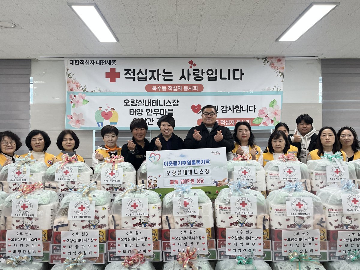 복수동 적십자봉사회, 취약계층에 겨울나기 생필품 전달 (대전서구 제공) [PEDIEN] 대전 서구 복수동 적십자봉사회가 지역 내 취약계층을 위한 따뜻한 나눔을 실천했다.오량실내테니스장, 외양간갈비, 태양한우 등 복수동 관내 업체들이 십시일반 힘을 모아 200만원 상당의 생필품을 적십자봉사회에 기탁한 것이다.기탁된 물품은 라면, 김, 세제 등 생활 필수품으로 구성됐다. 복수동 적십자봉사회는 봉사회원들이 직접 독거노인, 한부모 가정 등 어려운 이웃 40여 가구를 방문하여 물품을 전달했다.이미영 복수동 적십자봉사회 회장은 “아직도 우리 주변에는 공공복지의 손길이 미치지 못하는 이웃들이 많다”며, “앞으로도 복지 사각지대를 적극적으로 발굴하고 지원하는 데 최선을 다하겠다”고 밝혔다.김영란 복수동장은 “지역사회를 위해 꾸준히 나눔을 실천하는 적십자봉사회 회원들에게 깊이 감사드린다”며, “이번 기탁을 통해 따뜻한 나눔 문화가 더욱 확산되기를 기대한다”고 말했다. 복수동은 앞으로도 민관 협력을 통해 복지 사각지대 해소에 적극적으로 나설 계획이다. -