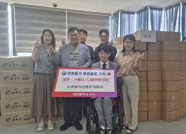 노아외식산업, 1,300만원 상당 명절 음식 서구에 기탁 [PEDIEN] 대전 서구는 지난 1일 관내 식품 제조·가공업체 노아외식산업 주식회사로부터 1,300만원 상당의 송편과 누룽지를 기탁받았다고 2일 전했다. 기탁된 물품은 대전지체장애인협회 서구지회 회원 약 3,200명에게 전달될 예정이다. 노아외식산업은 매년 명절과 수해 등 어려움이 있을 때마다 저소득층 가정과 사회복지시설에 송편, 떡국떡 등 식품을 꾸준히 기부하며 지역사회 나눔 문화 확산에 앞장서고 있다. 구일회 노아외식산업 대표는 “풍요로운 한가위를 맞아 소외된 이웃들이 따뜻한 명절을 보낼 수 있기를 바라는 마음으로 기탁했다”며 “앞으로도 지역사회에 사랑과 희망을 전하는 나눔 활동을 이어가겠다”고 말했다. 서철모 청장은 “매년 잊지 않고 나눔을 실천해 주시는 노아외식산업에 깊이 감사드린다”며 “이웃과 함께하는 따뜻한 서구를 만들기 위해 최선을 다하겠다”고 밝혔다. -