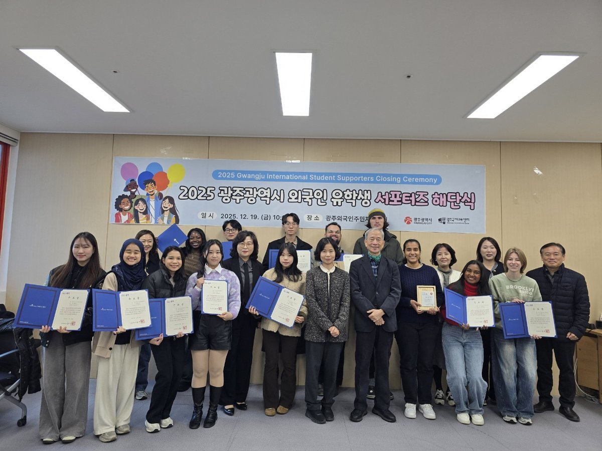 외국인 유학생 서포터즈 해단식 광주광역시 제공 [PEDIEN] 광주광역시는 19일 광주외국인주민지원센터에서 ‘2025년 광주 외국인유학생 서포터즈 해단식’을 열고, 10개월간의 활동을 마무리했다.이날 해단식에서는 활동 성과 공유와 함께 우수 서포터즈에 대한 시상도 진행했다.외국인유학생 서포터즈는 광주지역 6개 대학에 재학 중인 베트남, 인도, 독일, 필리핀, 중국, 우즈베키스탄 등 16개국 출신의 유학생 21명으로 구성됐다.서포터즈들은 지난 3월 발대식 이후 이달까지 광주시와 지역대학의 매력을 세계에 알리는 등 다양한 홍보활동을 펼쳤다.지역대학 투어, 유학생의 날, 세계시민의 날 등 각종 행사에 참여하고, 광주에서의 생활 경험을 콘텐츠로 제작해 사회관계망서비스에 게시하며 광주의 매력을 알렸다.그 결과, 유학생들이 게시한 콘텐츠는 총 207건에 달했으며, 7741건의 ‘좋아요’를 받는 등 높은 호응을 얻어 광주의 국제적 이미지를 높이는 게 기여했다.우수 서포터즈로 선정된 △곤살레스 구티에레스 루이스 안드레스 △메디나 쿠에바스 페를라 코랄 △누룰 쿠라투아이니 빈티 모하마드 파즐리가 광주시장상을, △다나카모에가 광주국제교류센터장상을 수상했다.수상자는 개인별 활동 참여 횟수, 콘텐츠 게시 건수, 콘텐츠 인기도 등을 종합 평가해 고득점자 순으로 선정했다.김기숙 교육청년국장은 “다양한 국적과 배경을 가진 서포터즈들의 활동은 광주와 지역대학을 세계에 알리는 중요한 가교역할을 했다”면서 “앞으로도 광주에서의 경험을 바탕으로 더 큰 꿈을 펼쳐나가길 바란다”고 말했다. -