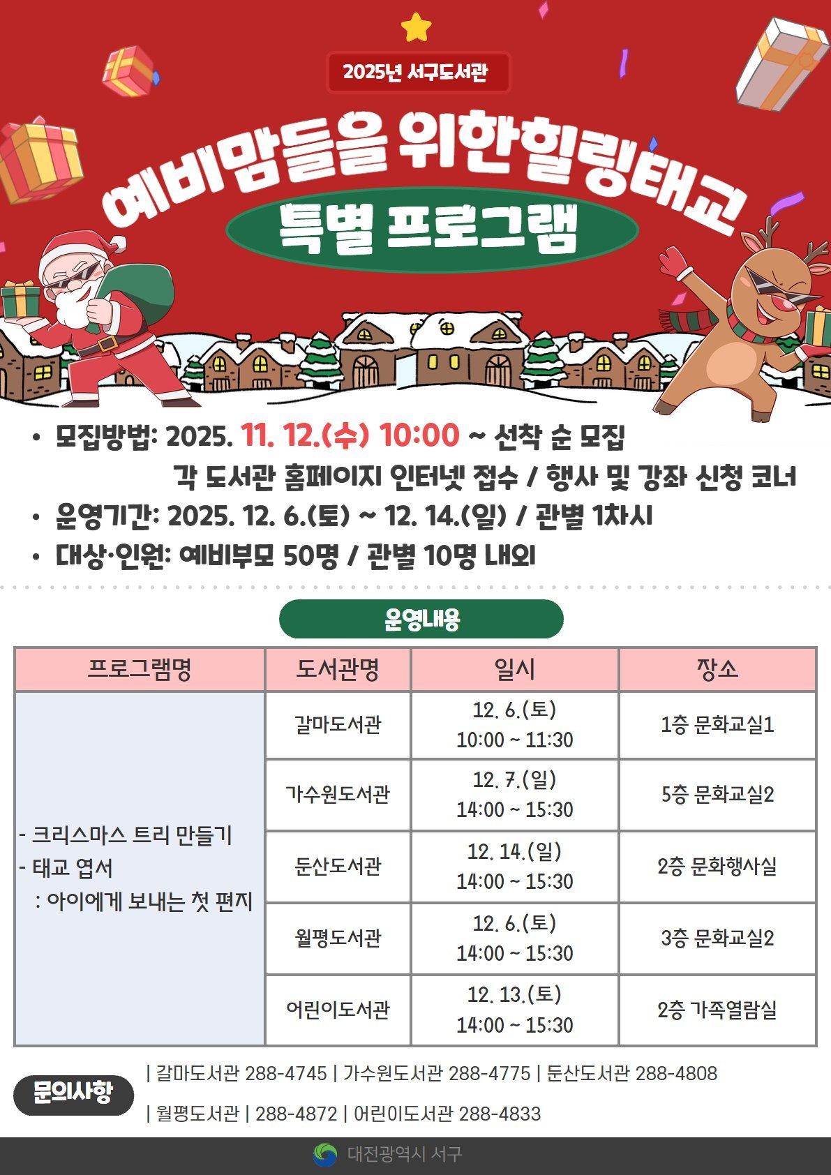 크리스마스_트리_만들기_및_태교_엽서_프로그램_홍보물 [PEDIEN] 대전 서구가 임신부의 정서적 안정과 행복한 가족 문화 조성을 위해 특별한 크리스마스 태교 프로그램을 운영한다.이번 프로그램은 '크리스마스트리 만들기 및 태교 엽서'로, 임신 중인 주민들이 따뜻한 연말 분위기 속에서 태아와 교감하고 심리적 안정을 얻도록 기획됐다.프로그램은 12월 6일부터 14일까지 서구 관내 5개 공공도서관(갈마, 가수원, 둔산, 월평, 어린이)에서 진행된다. 각 도서관별로 10명 내외의 임신부를 대상으로 운영될 예정이다.참가 신청은 11월 12일 오전 10시부터 각 도서관 홈페이지 '행사 및 강좌 신청' 메뉴를 통해 선착순으로 접수한다. 서구는 이번 프로그램이 임신부들에게 특별한 추억을 선사하고, 긍정적인 마음으로 출산을 준비하는 데 도움을 줄 것으로 기대한다.서구 관계자는 “이번 프로그램이 임신부들이 태아와의 정서적 교감을 느끼고 가족과 함께 따뜻한 추억을 쌓는 기회가 되기를 바란다”며, “앞으로도 주민들의 삶에 책과 문화가 자연스럽게 스며들 수 있는 맞춤형 프로그램을 지속적으로 마련할 계획”이라고 밝혔다.프로그램 관련 자세한 사항은 각 도서관(갈마, 가수원, 둔산, 월평, 어린이)으로 문의하면 된다. -