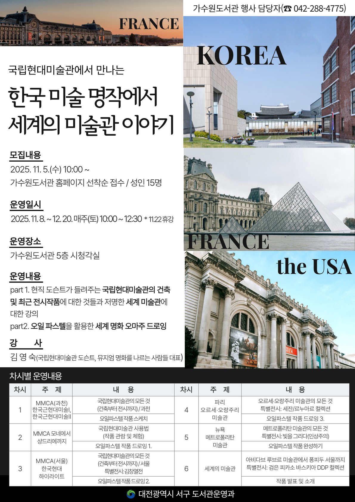 가수원도서관_프로그램_홍보물 [PEDIEN] 대전 서구 가수원도서관이 주민들의 문화 향유 기회를 확대하기 위해 특별한 미술 강좌를 운영한다.'국립현대미술관에서 만나는 한국 미술 명작에서 세계의 미술관 이야기'라는 주제로 진행되는 이번 프로그램은 미술관 방문이 어려운 주민들에게 폭넓은 미술 경험을 제공하고자 기획됐다.강좌는 11월 8일부터 12월 20일까지 매주 토요일 오전 10시에 총 6회에 걸쳐 진행된다. 전문 해설사의 흥미로운 이야기와 함께 오일 파스텔을 이용한 명작 재해석 체험도 준비되어 있다.이번 강좌는 국립현대미술관을 비롯한 세계 주요 미술관의 역사와 대표 작품에 대한 이해를 높이는 데 초점을 맞춘다. 참가자들은 미술사 지식을 쌓는 것은 물론, 직접 그림을 그리며 창의적인 표현 능력을 키울 수 있다.참가 신청은 10월 5일 오전 10시부터 가수원도서관 홈페이지를 통해 선착순으로 접수한다. 모집 인원은 15명이며, 지역 주민 누구나 신청 가능하다.도서관 관계자는 이번 강좌를 통해 주민들이 국내외 미술의 흐름을 이해하고 문화 감수성을 높일 수 있기를 기대한다고 밝혔다. 자세한 내용은 가수원도서관 홈페이지를 참고하거나 전화 문의를 통해 확인할 수 있다. -