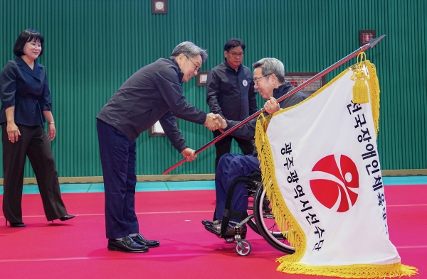 “용기와 희망을”…전국장애인체전 광주선수단 결단식 [PEDIEN] 광주 장애인체육 선수단이 ‘제45회 전국장애인체육대회’를 앞두고 필승의 각오를 다졌다. 광주광역시체육회는 17일 광주시장애인국민체육센터에서 강기정 회장과 서용규 광주시의회 부의장, 기관단체 회장, 선수, 임원 등이 참석한 가운데 ‘제45회 전국장애인체육대회 광주선수단 결단식’을 가졌다. 결단식은 전국장애인체육대회 참가 보고를 시작으로 선수단기 전달, 격려사, 선수대표 선서 등의 순으로 진행됐다. 선수대표 선서는 이승후 선수와 한다영 선수가 나서 필승의 결의를 다졌다. 이승후 선수는 광주선수단의 최연소 선수로 현재 국가대표로 선발돼 활약 중이며 한다영 선수는 오는 11월 개최되는 2025 도쿄 데플림픽 국가대표로 출전을 준비하고 있다. 2년 연속 종합 5위의 우수한 성적을 거둔 광주선수단은 올해에도 상위권을 목표로 배드민턴 등 총 22개 종목에 394명의 선수들이 출전한다. 2019년과 2025년 세계장애인양궁선수권대회에서 금메달 획득한 양궁 김옥금 선수를 비롯해 골프 황선하, 보치아 강선희, 펜싱 조성환, 역도 박광혁, 양지은 선수의 활약이 기대된다. 이번 결단식에는 지역에 기반을 둔 우미건설을 비롯한 기업·단체 등 30여 곳이 장애인체육 발전과 출전 선수들의 사기 진작을 위한 후원금을 기탁, 선수단의 선전에 힘을 보탰다. 회장인 강기정 광주시장은 “이제까지 땀 흘려 갈고닦은 기량을 마음껏 펼치고 선수 개개인의 꿈을 이루는데 한걸음 더 나아가기를 응원한다”며 “여러분의 도전이 많은 이들에게 용기와 희망이 되고 있다. 광주시민 모두가 여러분을 응원하고 있으니 자신감을 가지고 최선을 다해주시길 바란다”고 당부했다. 한편 제45회 전국장애인체육대회는 10월 31일부터 11월 5일까지 부산에서 열린다. -