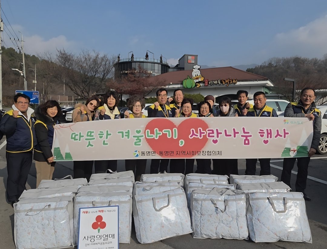 동명면 지사협, 따뜻한 겨울나기 사랑의 이불 나눔 행사 (칠곡군 제공) [PEDIEN] 동명면 지역사회보장협의체가 지난 17일, 관내 취약계층을 대상으로 따뜻한 겨울나기 사랑의 이불 나눔 행사를 진행했다.이번 행사는 겨울철 난방에 어려움을 겪는 독거노인과 취약계층 가정이 따뜻하게 겨울을 보낼 수 있도록 마련되었다. 협의체 위원들은 정성껏 준비한 겨울 이불을 직접 전달하며 안부를 확인하는 시간을 가졌다.김성동 동명면장은 작은 나눔이지만 어려운 이웃들에게 따뜻한 위로가 되기를 바란다고 전했다. 또한 앞으로도 지역 내 소외되는 이웃이 없도록 복지 안전망 구축에 최선을 다하겠다고 밝혔다.김금숙 민간위원장은 이번 이불 나눔이 지역의 따뜻한 마음을 전하는 계기가 되었다고 말했다. 더불어 협의체 위원들과 함께 지속적으로 이웃을 살피는 나눔 활동을 이어갈 것을 약속했다. -