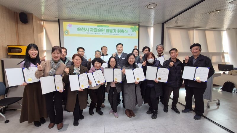 순천시, 자원순환 실천을 위한 자원순환 활동가 위촉 (순천시 제공) [PEDIEN] 순천시는 지난 11일 순천시 업사이클센터 더새롬에서 자원순환 실천을 선도할 시민 자원순환 활동가 17명에게 위촉장을 전달했다.이번에 위촉된 활동가들은 순천시 자원순환아카데미 교육과정을 이수한 시민들로, 2026년부터 지역 사회에서 자원순환 실천 리더로 활동하게 된다.이들은 시민들에게 자원순환의 중요성을 알리고, 일상 속에서 자원순환을 실천할 수 있도록 돕는 중요한 역할을 맡게 된다.지역 내에서 쓰레기 감량, 자원순환, 재활용을 촉진하는 캠페인과 실천 활동을 펼치게 된다.자원순환아카데미 교육 과정은 3월부터 12월까지 진행됐으며, 기본교육 4회와 심화교육 4회를 포함한 총 8회로 진행돼 자원순환에 대한 이해와 실천 역량을 높였다.시 관계자는 “자원순환 활동가들의 적극적인 참여와 실천을 통해 순천시의 환경 보호와 자원순환 문화 확산에 기여할 것으로 기대한다”며 “시민들의 많은 관심과 지원을 부탁드린다”고 말했다.