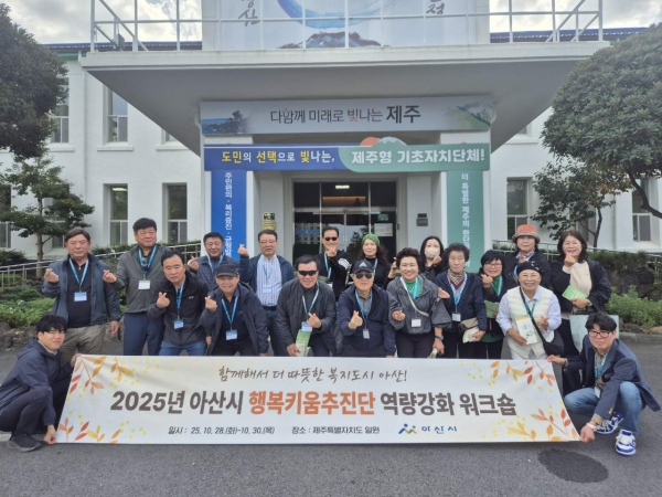 아산시, 2025 행복키움추진단 역량강화 워크숍 실시 [PEDIEN] 아산시는 지난 28일부터 30일까지 3일간 제주도 일원에서 ‘2025 아산시 행복키움추진단 역량강화 워크숍’을 개최했다고 밝혔다. 이번 워크숍에는 17개 읍면동 행복키움추진단장 등 20여명이 참석했으며 읍면동 간 교류를 통해 민관협력 복지체계의 현장 역량을 강화하고 시민활동가로서의 전문성을 높이기 위해 마련됐다. 주요 프로그램으로는 △읍면동별 행복키움추진단 활동사항 공유 및 발전방안 논의 △제주시지역사회보장협의체와의 교류·벤치마킹 △문화탐방 및 체험활동 등이 진행됐다. 우재원 아산시행복키움추진단협의회장은 “이번 워크숍을 통해 읍면동 간 장벽을 허물고 민간과 공공이 더욱 긴밀히 협력하는 계기가 됐다”며 “앞으로도 행복키움추진단은 촘촘한 복지안전망을 구축하기 위해 최선을 다하겠다”고 말했다. 김민숙 아산시 사회복지과장은 “행복키움추진단은 행정이 미처 닿지 못하는 복지 현장에서 주민과 행정을 연결하는 든든한 다리 역할을 하고 있다”며 “시에서도 단원들이 안정적으로 활동할 수 있도록 적극 지원하고 민관이 함께 성장하는 지속가능한 복지체계를 만들어가겠다”고 밝혔다. -