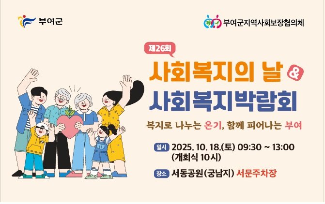 제26회 사회복지의 날 및 사회복지박람회 포스터 [PEDIEN] 부여군(군수 박정현)은 오는 10월 18일(토) 서동공원 서문주차장에서 ‘제26회 사회복지의 날 및 사회복지박람회’를 개최한다고 밝혔다.이번 박람회는 사회복지 기관·단체·공공기관·군민이 함께 참여하는 민·관 협력 행사로 부여군이 주최하고 부여군 지역사회보장협의체가 주관해 군민들에게 다양한 사회복지 정보를 제공하고 복지 서비스를 직접 체험할 수 있는 장으로 마련됐다.‘복지로 나누는 온기, 함께 피어나는 부여’라는 슬로건 아래, 본식에서는 ▲유공자 표창 ▲슬로건 공모 시상 ▲희망 손수건 휘날리기 축하 퍼포먼스 등이 진행되며 어울림마당에서는 지역아동센터, 어린이집 등 다양한 기관과 시설에서 준비한 공연을 선보일 예정이다.올해는 작년보다 5개가 늘어난 41개 부스가 운영되며 각 부스에서는 사회복지 관련 홍보와 체험 프로그램이 다채롭게 진행된다.특히 인공지능(AI)을 활용한 어린이 창의 융합 교육과 시니어 대상 치매 인지 치료교육 체험 프로그램이 새롭게 마련되어 관람객들의 이목을 끌 전망이다.군 관계자는 “이번 행사가 군민들이 사회복지를 좀 더 친근하게 이해하고 직접 체험할 수 있는 소통과 공감의 장이 되길 바란다”라며 “앞으로도 군민 중심의 맞춤형 복지 서비스를 지속적으로 발굴·확대해 모두가 함께 웃는 따뜻한 복지 공동체를 만들어 가겠다”라고 말했다. -