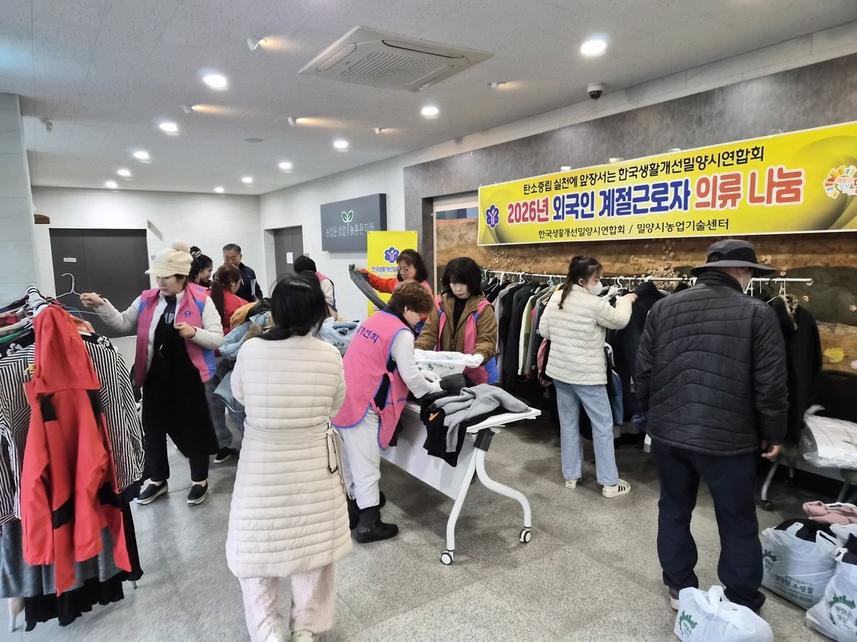한국생활개선밀양시연합회, 외국인 계절 근로자 대상 '사랑의 의류 나눔'실천 (밀양시 제공) [PEDIEN] 한국생활개선밀양시연합회가 외국인 계절 근로자를 위한 '사랑의 의류 나눔' 행사를 3년째 개최하며 훈훈함을 더하고 있다.밀양시농업기술센터 농업인교육관에서 열린 이번 행사는 지역 농업의 중요한 부분을 담당하는 외국인 근로자들의 안정적인 정착을 돕고, 자원 재활용을 통해 탄소 중립을 실천하고자 마련됐다.생활개선회 회원 568명이 기증한 작업복 200여 벌은 외국인 근로자들이 직접 선택하여 가져갈 수 있도록 준비됐다. 나눔에 참여한 근로자는 지역 농가에서 근무 중인 64명과 당일 입국한 8명으로 총 72명이다.회원들은 현장에서 바로 사용할 수 있는 실용적인 의류를 중심으로 선별하여 전달하며 실질적인 도움을 주고자 노력했다. 단순한 물품 전달을 넘어, 버려질 수 있는 의류를 재활용함으로써 환경 보호와 탄소 절감이라는 사회적 가치를 실현했다는 점에서 의미가 깊다.안화영 회장은 “우리 지역 농촌 현장에서 애쓰고 있는 외국인 근로자들에게 따뜻한 응원의 마음이 전달되기를 바란다”며, “앞으로도 지속적인 나눔과 환경 보호 활동을 통해 활기찬 농촌을 만드는 데 앞장서겠다”고 밝혔다.이번 의류 나눔은 외국인 근로자들의 생활 안정에 기여하는 것은 물론, 지역 사회의 따뜻한 정을 나누는 의미 있는 행사로 평가받고 있다. -