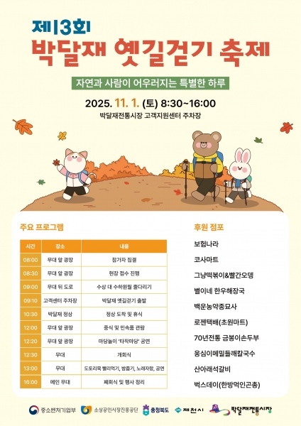 [PEDIEN] 제13회 박달재 옛길걷기 행사가 오는 11월 1일 박달재전통시장 일원에서 개최된다.