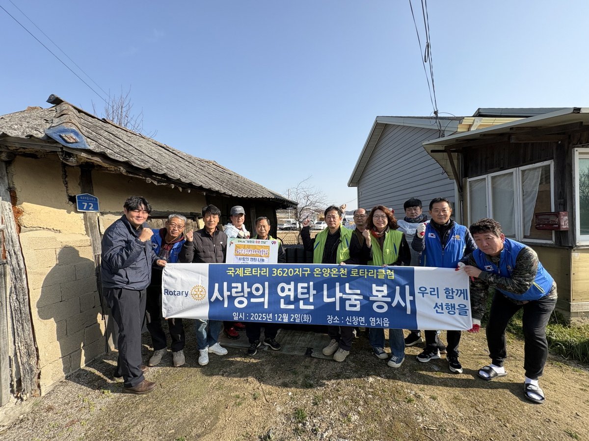 [PEDIEN] 온양온천로타리클럽이 아산시 염치읍의 난방 취약 가정을 위해 따뜻한 나눔을 실천했다.클럽은 염치읍 행복키움추진단과 함께 '사랑의 연탄나눔' 행사를 열고, 어려운 이웃들에게 온정을 전했다.이번 나눔을 통해 염치읍 관내 난방 취약 가구 1곳에 연탄 500장이 전달되어, 추운 겨울을 따뜻하게 보낼 수 있도록 지원했다.온양온천로타리클럽의 이번 연탄 나눔은 겨울철 난방비 부담으로 어려움을 겪는 주민들에게 실질적인 도움을 주기 위해 마련되었다.클럽은 지난 11월 김장김치 30박스를 기탁한 데 이어, 연말연시를 맞아 꾸준히 지역사회 나눔 활동을 이어가고 있다.이상훈 회장은 “한파가 시작되기 전 소외된 이웃에게 조금이라도 따뜻함을 전하고자 연탄나눔을 준비했다”고 밝혔다.이어 “앞으로도 지역사회와 함께 성장하는 봉사와 나눔 활동을 지속적으로 실천하겠다”고 덧붙였다.강명구 공동단장은 “연탄 500장은 한 가정의 겨울을 든든하게 지켜주는 큰 도움이 된다”며 온양온천로타리클럽에 감사를 표했다.또한 “필요한 가정에 신속히 전달하겠다”고 약속했다.심용근 염치읍장은 “김장김치에 이어 연탄까지 후원해 주신 온양온천로타리클럽에 감사드린다”고 말했다.덧붙여 “민·관이 함께 만드는 따뜻한 나눔 문화가 지역사회 전반으로 확산될 수 있도록 행정에서도 적극 협력하겠다”고 강조했다.
