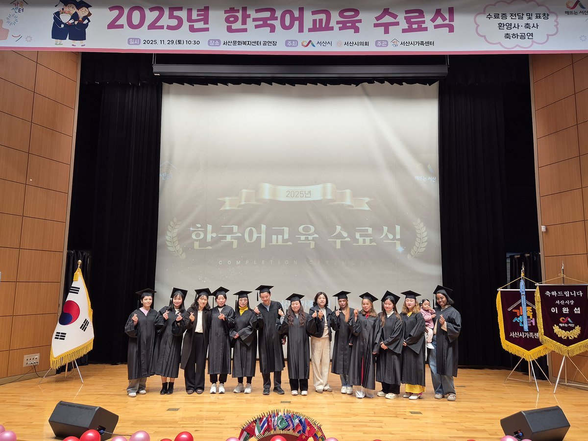 서산시, 2025년 한국어교육 수료식 개최 (서산시 제공) [PEDIEN] 서산시가 지난 29일 문화복지센터에서 '2025년 한국어교육 수료식'을 개최했다.결혼이민자와 중도입국자녀 150여 명이 참석한 가운데, 한국어 교육 과정을 마친 이들의 노고를 격려하고 지역사회 구성원으로서의 성장을 응원하는 자리였다.이번 수료식은 단순한 언어 교육을 넘어, 이들이 지역 사회에 안정적으로 정착하도록 돕는 데 중요한 의미를 가진다.수료식은 수료증 전달, 모범 학습자 표창, 축하 공연, 활동 영상 상영 등으로 다채롭게 진행됐다. 학습자 가족들도 참석하여 함께 기쁨을 나누었다.류순희 서산시가족센터장은 “수료생 모두를 축하하며, 한국어 교육이 가족과 이웃, 지역사회를 연결하는 기반이 되기를 바란다”고 전했다.이완섭 서산시장은 “어려운 과정 속에서도 포기하지 않고 수업에 열심히 참여해 주셔서 감사하다”며, “앞으로도 지역사회에 안정적으로 정착할 수 있도록 행정적 지원을 아끼지 않겠다”고 약속했다.서산시는 앞으로도 결혼이민자들의 한국어 교육을 지원하고, 지역사회 구성원으로서의 역량 강화를 위한 다양한 프로그램을 운영할 계획이다. -