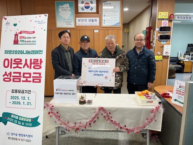 아산시 염치읍, ‘희망2026나눔캠페인’집중모금 행사 진행 (아산시 제공) [PEDIEN] 아산시 염치읍이 지난 16일, 염치읍 행정복지센터에서 '희망2026 나눔캠페인' 집중 모금 행사를 개최했다.이번 행사는 지역 내 어려운 이웃을 돕고 나눔 문화를 확산하기 위해 마련됐다. 이장협의회, 노인회 등 여러 기관과 단체, 지역 기업체, 그리고 많은 주민들이 참여하여 따뜻한 나눔의 의미를 더했다.이날 행사에서는 현장 모금과 성금 전달식이 진행됐다. 모금된 성금은 충남사회복지공동모금회를 통해 저소득층과 복지 사각지대에 놓인 이웃들을 위해 쓰일 예정이다.심용근 염치읍장은 추운 날씨에도 나눔에 동참해 준 주민들에게 감사를 표했다. 심 읍장은 이번 캠페인이 어려운 이웃에게 희망을 전하고, 지역사회에 나눔 문화가 더욱 확산되는 계기가 되기를 바란다고 밝혔다.'희망2026 나눔캠페인'은 '행복을 더하는 기부, 나눔으로 행복한 아산'이라는 슬로건 아래 내년 1월 31일까지 진행된다. 염치읍 행정복지센터를 통해 성금 기탁 및 참여가 가능하다. -