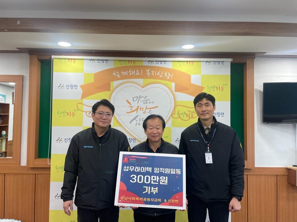 아산성우하이텍, 아산시 선장면에 ‘희망2026 나눔캠페인’성금 전달 (아산시 제공) [PEDIEN] 아산성우하이텍은 지난 16일 선장면 행정복지센터를 방문해 사회복지공동모금회 ‘희망2026 나눔캠페인’성금 300만 원을 전달했다.이번 성금은 아산성우하이텍 임직원들이 이웃사랑 실천을 위해 자발적으로 뜻을 모아 마련한 것으로, 지역사회에 따뜻한 온정을 전하고자 하는 마음이 담겼다.아산성우하이텍은 선장면과 신창면에 생산공장을 둔 기업으로, 자동차 차체 부품 및 전기차 배터리 케이스 등을 생산하고 있으며, 매년 임직원과 함께 성금 기탁을 이어오며 꾸준한 나눔 활동을 실천하고 있다.공대훈 대표는 “임직원 모두가 한마음으로 모은 성금이 어려운 이웃들에게 작은 희망이 되기를 바란다”며 “앞으로도 지역사회와 함께 성장하며 사회적 책임을 다하는 기업이 되도록 노력하겠다”고 말했다.이정진 선장면장은 “아산성우하이텍 임직원 여러분의 따뜻한 관심과 지속적인 나눔에 깊이 감사드린다”며 “전달된 성금은 사회복지공동모금회를 통해 도움이 필요한 이웃들에게 소중히 전달하겠다”고 전했다. -