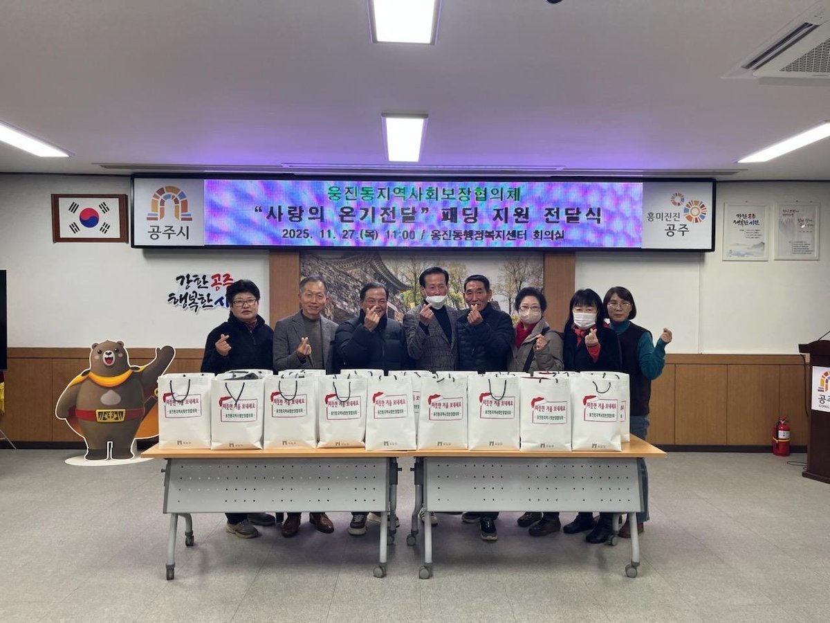 공주시 웅진동, ‘사랑의 온기전달 패딩’나눔 (공주시 제공) [PEDIEN] 공주시 웅진동에서 훈훈한 나눔 소식이 전해졌다. 웅진동 지역사회보장협의체가 지난 27일, 관내 저소득 어르신 17명에게 따뜻한 겨울 패딩을 전달하는 행사를 개최했다.이번 행사는 추운 겨울, 경제적인 어려움으로 따뜻한 외투를 마련하기 힘든 어르신들을 위해 마련됐다. 따뜻한 겨울옷 지원을 통해 어르신들의 건강한 겨울나기를 돕고, 지역사회에 나눔 문화를 확산하는 데 목적을 뒀다.패딩을 지원받은 한 어르신은 “외출할 때 마땅히 입을 옷이 없어 걱정했는데, 이렇게 따뜻한 패딩을 선물 받으니 정말 기쁘다”라며 감사의 마음을 표현했다.심재승 웅진동 지역사회보장협의체 위원장은 “어르신들이 따뜻하게 겨울을 보내실 수 있도록 이번 행사를 준비했다”며, “앞으로도 어려운 이웃들을 위한 다양한 지역 복지 활동을 꾸준히 추진할 계획”이라고 밝혔다.송의석 웅진동장은 “올 한 해 동안 소외된 이웃들을 위해 헌신적으로 봉사해 주신 지역사회보장협의체 위원들에게 깊은 감사를 드린다”며, “앞으로도 웅진동 주민 모두가 따뜻하고 행복하게 지낼 수 있도록 최선을 다하겠다”고 다짐했다. -