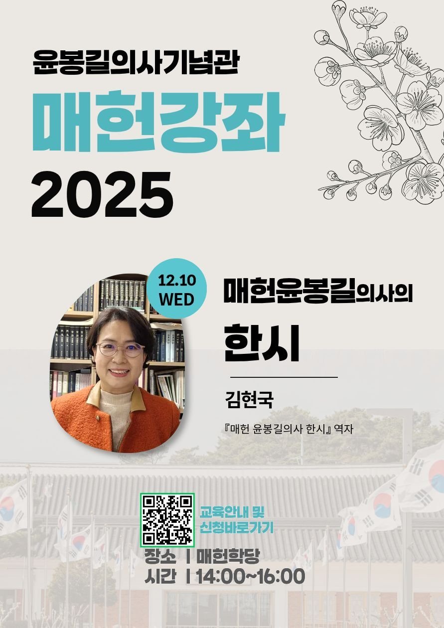 예산군 윤봉길의사기념관, 제1회 매헌강좌 성료 (예산군 제공) [PEDIEN] 윤봉길의사기념관이 지난달 26일 매헌학당에서 개최한 제1회 매헌강좌가 성황리에 마무리됐다. 이번 강좌에는 40여 명의 성인이 참여하며 윤봉길 의사에 대한 높은 관심을 나타냈다.황선익 국민대학교 한국역사학과 교수가 강사로 초청되어 윤봉길 의사의 상하이 의거를 둘러싼 당시 미주 한인사회의 분위기와 대한민국임시정부의 상황, 국내외 정세 등을 다양한 사료를 통해 생생하게 전달했다.참가자들은 강좌를 통해 윤봉길 의사와 독립운동가들을 기리기 위한 임시정부와 민간의 노력을 깊이 이해하는 시간을 가졌다. 또한 윤봉길 의사의 생가와 유품이 윤봉길의사기념관에 소장되어 있다는 사실을 되새기며, 현재의 자유와 평화가 순국선열의 숭고한 희생 위에 세워졌음을 깨달았다.기념관은 제1회 강좌에 이어 다음 달 10일 오후 2시 매헌학당에서 제2회 매헌강좌를 개최한다. 이번 강좌에서는 윤봉길 의사의 한시를 주제로 김현국 한시 번역가를 초청하여 한시의 형식과 의미를 살펴보고, 참가자들이 직접 한시를 지어보는 실습형 프로그램도 진행될 예정이다.윤봉길 의사는 '오치서숙'에서 매번 장원을 차지할 만큼 뛰어난 한시 실력을 갖췄으며, 여러 편의 한시를 남겼다. 기념관은 윤봉길 의사의 정신을 계승하기 위한 프로그램에 많은 관심과 참여를 바란다고 밝혔다.