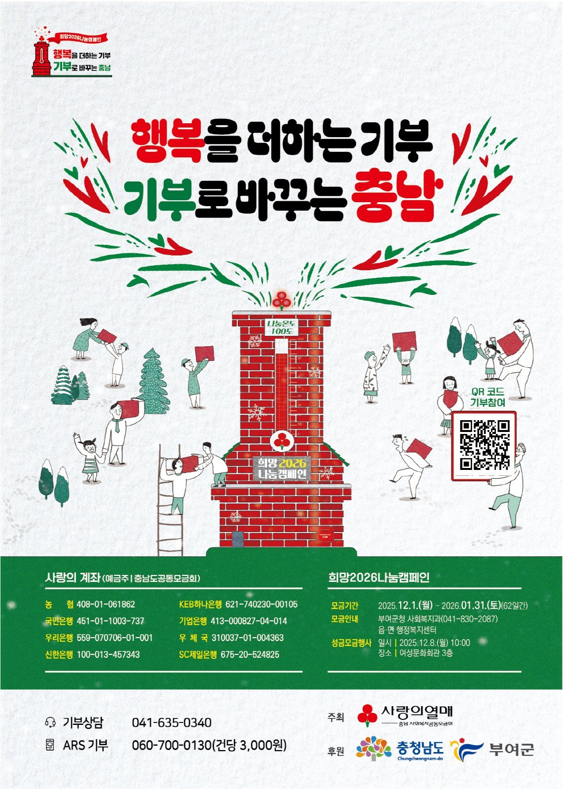부여군, 「희망 2026 나눔 캠페인」 내달 1일 시작 (부여군 제공) [PEDIEN] 부여군이 다음 달 1일부터 '희망 2026 나눔 캠페인'을 시작하여 어려운 이웃에게 따뜻한 겨울을 선물할 계획이다. 충남사회복지공동모금회와 함께 진행하는 이번 캠페인은 2026년 1월 31일까지 62일간 이어진다.부여군은 캠페인 홍보를 위해 다각적인 노력을 기울인다. 안내 우편 발송은 물론, 읍·면 지역과 유동 인구가 많은 곳에 현수막을 걸고 홍보 영상도 상영한다.특히 12월 8일 오전 10시에는 여성문화회관에서 순회 모금 행사가 열린다. 이 행사는 지역 사회의 나눔 문화를 확산하고 따뜻한 겨울을 지원하기 위해 마련된 연말 대표 모금 행사다. 군민과 각 기관, 단체가 함께 참여하여 의미를 더할 예정이다.이번 캠페인은 '행복을 더하는 기부, 기부로 바꾸는 부여'라는 슬로건 아래 진행된다. 기부를 원하는 군민은 군청이나 읍면 사무소를 방문하여 성금이나 현물을 기탁할 수 있다. 사회복지공동모금회 계좌 입금 또는 ARS 기부 등 다양한 방법으로 참여 가능하다.캠페인을 통해 모금된 성금은 투명하게 관리되며, 지역 내 복지 사각지대 발굴 및 지원, 긴급 지원, 사회복지시설 운영 지원 등 다양한 분야에 사용될 예정이다.한편, 부여군은 지난 한 해 동안 5억 6천 2백만 원을 모금했다. 이와 더불어 사회복지공동모금회 중앙회 지원금 및 복권 기금 등을 활용하여 취약 계층 가구에 총 9억 9천 9백만 원을 지원한 바 있다. -