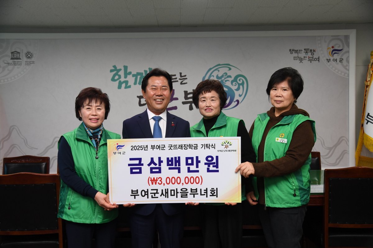 부여군새마을부녀회,부여군굿뜨래장학회 장학금 기탁 (부여군 제공) [PEDIEN] 부여군새마을부녀회가 지역 인재 육성을 위해 굿뜨래장학회에 장학금 300만원을 기탁하며 따뜻한 나눔을 실천했다.이번 기탁금은 지난 11월 초 사흘간 열린 임산물 축제에서 부녀회가 운영한 부스 수익금으로 마련됐다. 부여군새마을부녀회는 축제 참여뿐 아니라 지역 사회를 위한 꾸준한 나눔 활동을 이어오고 있다.한선옥 부여군새마을부녀회장은 “회원들의 작은 정성이 모여 지역 인재 육성에 조금이나마 도움이 되기를 바란다”며, “지역 인재들이 바르게 성장하여 부여군의 주역이 되기를 희망한다”고 밝혔다.박정현 부여군수는 “지역 학생들을 위한 따뜻한 마음에 감사드린다”며, “소중한 장학금이 학생들이 꿈을 마음껏 펼치고 올바르게 성장하는 데 도움이 되도록 노력하겠다”고 화답했다. -