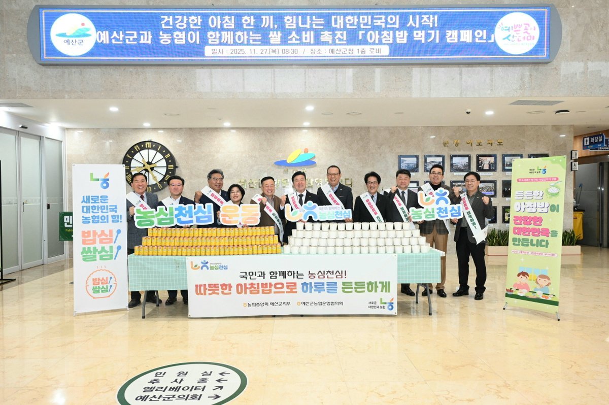 예산군, 농협과 함께 쌀 소비촉진 범국민 아침밥 먹기 캠페인 전개 (예산군 제공) [PEDIEN] 예산군이 농협중앙회 예산군지부와 함께 쌀 소비 촉진을 위한 '범국민 아침밥 먹기 캠페인'을 개최했다.이번 캠페인은 아침 식사 결식률이 높아지는 상황에 대응하여, 건강한 식생활 문화 정착과 국산 쌀 소비 확대를 목표로 기획됐다.지난 11월 27일 열린 행사에는 예산군수, 예산군의회 의장, 농협 관계자 등 30여명이 참석했다. 이들은 출근길 직원 및 방문객들에게 컵밥과 음료 400세트를 직접 전달하며 아침밥의 중요성을 알리고 우리 쌀 소비에 대한 공감대를 넓혔다.황기훈 예산군지부장은 캠페인을 통해 아침밥의 가치를 되새기고 건강한 식문화를 확산하는 동시에, 쌀 소비 확대를 통해 지역 농가 소득 증진에 기여하기를 희망한다고 밝혔다.예산군수는 쌀이 우리 식탁의 중심이자 농업의 근간임을 강조하며, 앞으로도 지역 농업인을 위한 실질적인 쌀 소비 촉진 활동과 지역 밀착형 프로그램을 지속적으로 추진할 계획이라고 전했다. -