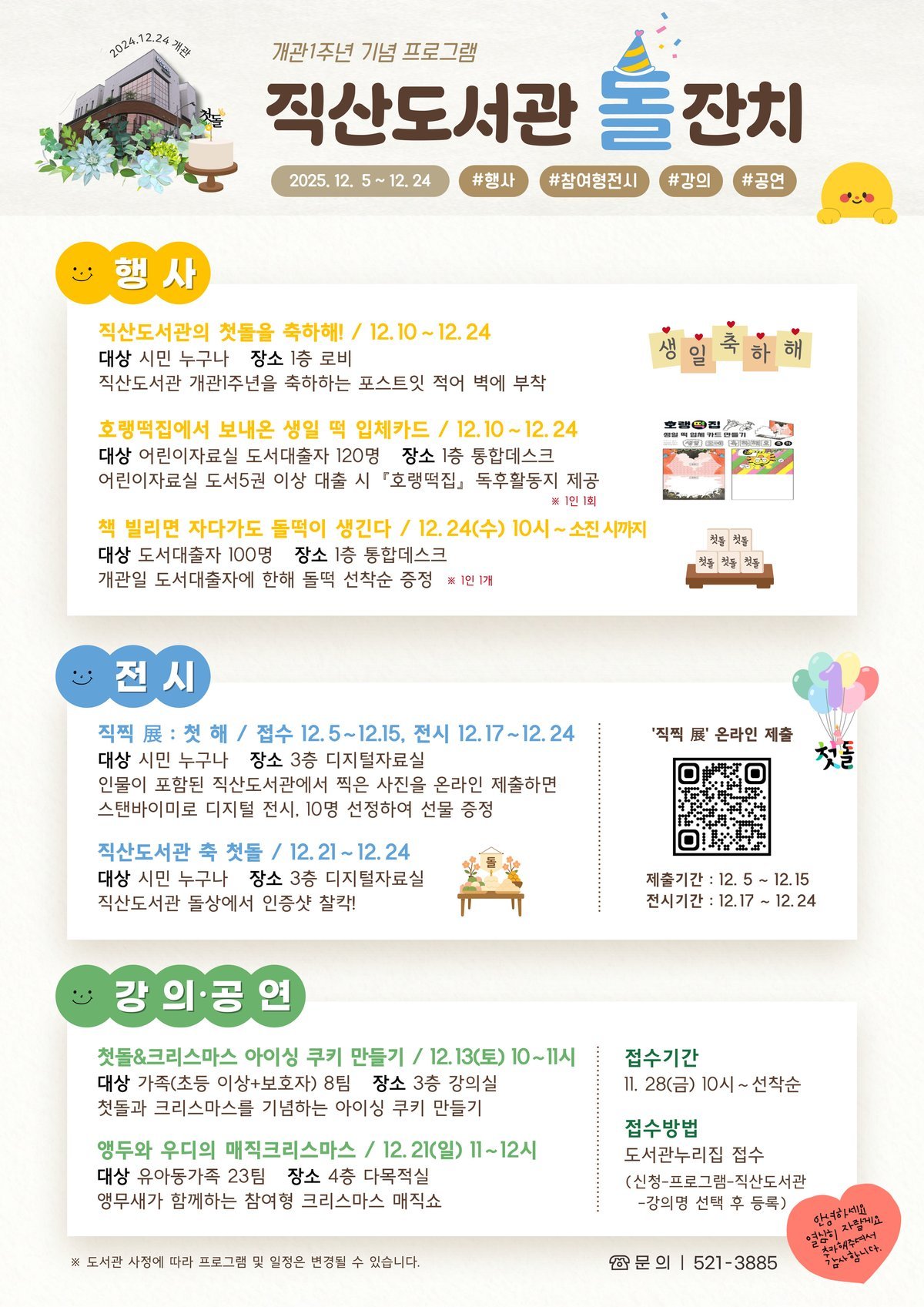 [PEDIEN] 천안시 직산도서관이 개관 1주년을 맞아 다음 달 5일부터 24일까지 특별한 '돌잔치' 행사를 개최한다.지난해 12월 24일 개관한 직산도서관은 천안시의 아홉 번째 공공도서관이다. 감각적인 공간 구성과 최신 ICT 장비, 다양한 독서문화 프로그램 운영을 통해 지역의 복합문화공간으로 빠르게 자리 잡았다.이번 돌잔치에서는 개관 1주년 축하 메시지 작성, 도서 대출 이벤트, 사진전, 쿠키 만들기 체험, 크리스마스 공연 등 다채로운 프로그램이 진행될 예정이다.특히, 도서관 내부에 돌상을 마련하여 방문객들에게 특별한 즐거움을 선사할 계획이다. 직산도서관은 이번 행사를 통해 지역 주민들에게 더욱 친근하게 다가가고, 도서관 이용 활성화에 기여할 것으로 기대된다.